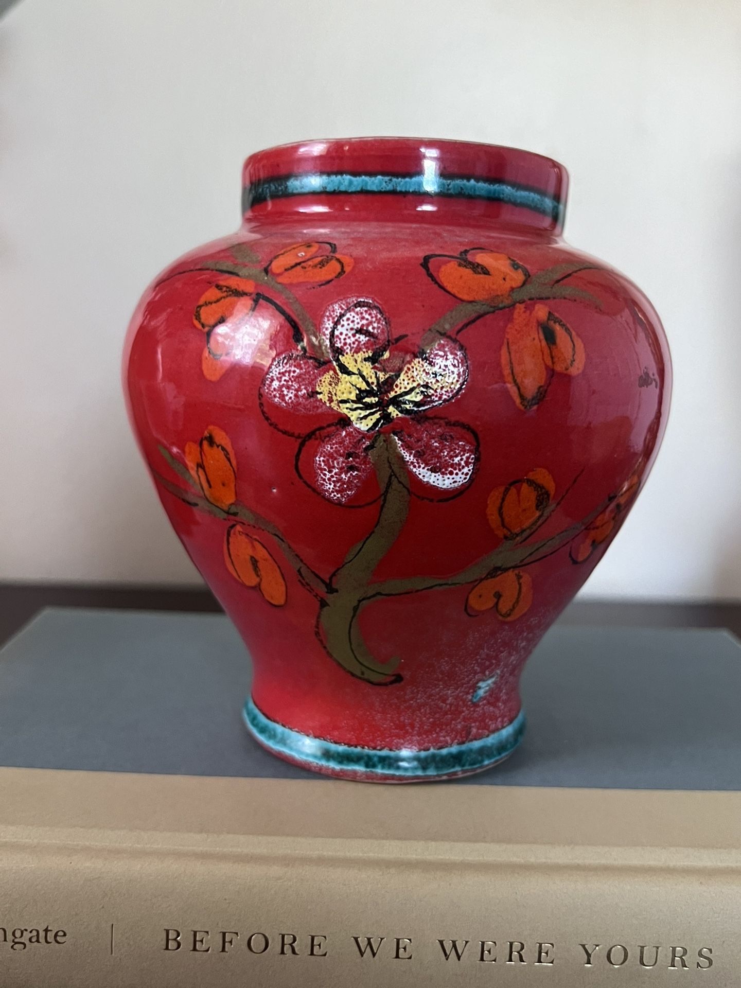 This Italian vase boasts bright, colorful, floral design that was hand painted. Both the rim and the base are surrounded by a unique turquoise colored band that makes this vase pop even more. Definitely a statement piece. Very versatile, would look great in any room of your house. Height: 5 inches Width: 5 inches at its widest