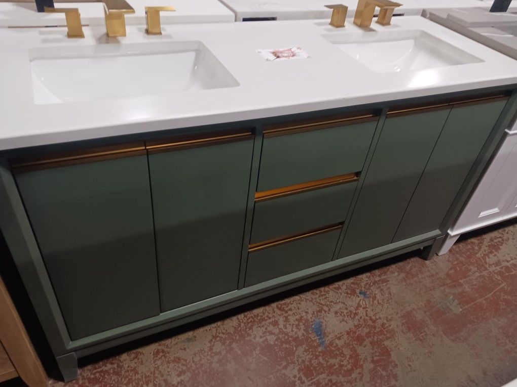 60" Green Bathroom Vanity with Quartz Top, Sinks, & Faucets for $1350