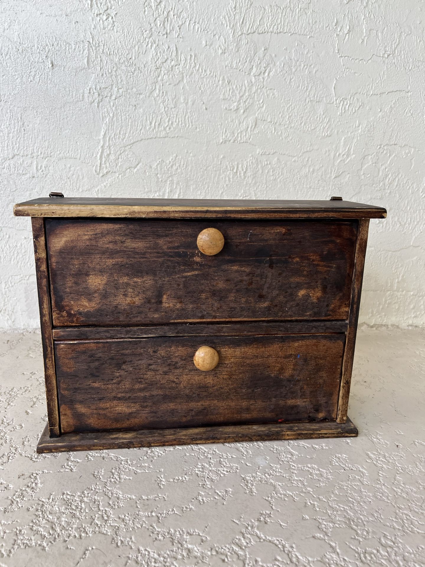 Vintage wooden spice rack (15 1/4 length by 11 1/4 height by 3 1/4 width). Has hooks to hang or can sit on counter.