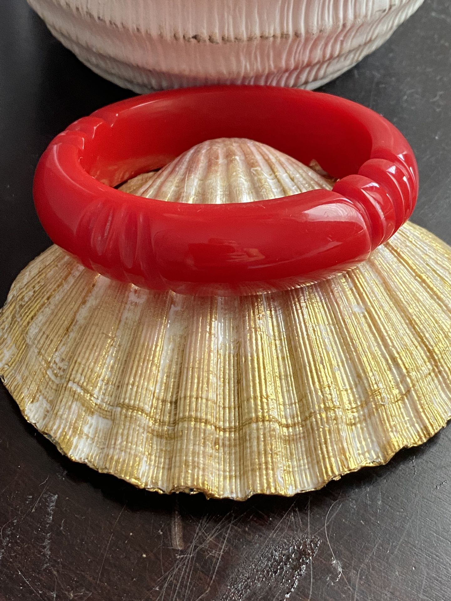 Lucite Bright Red Carved Ridged Large Vintage Bangle.
