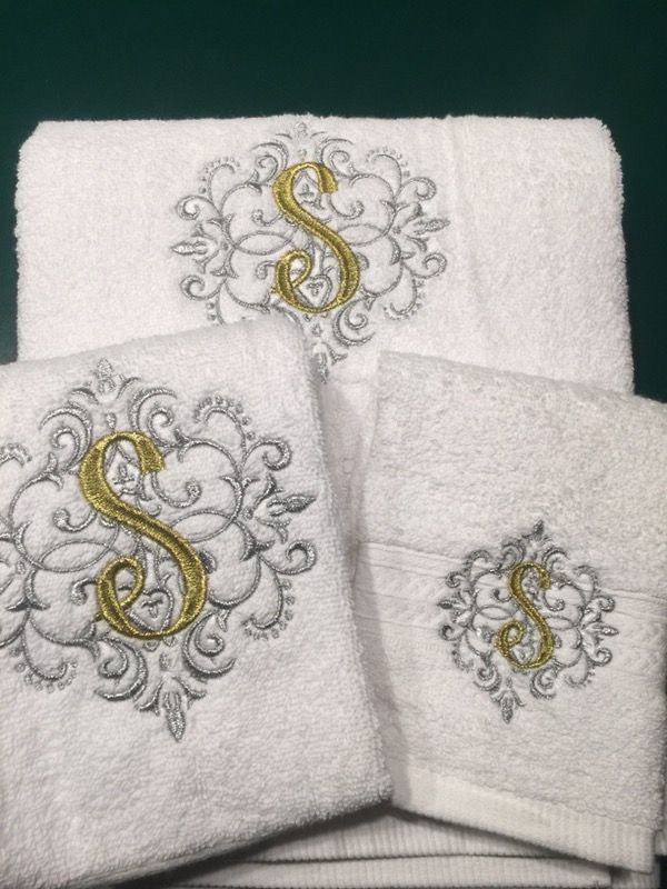 Personalized towel set . You can choose colors and letters .It’s 3 towels in set . With metallic threads embroidered. One large 30in x52 in , one smaller 16x30 in . And 13x13 in .100% cotton soft , durable , absorbent