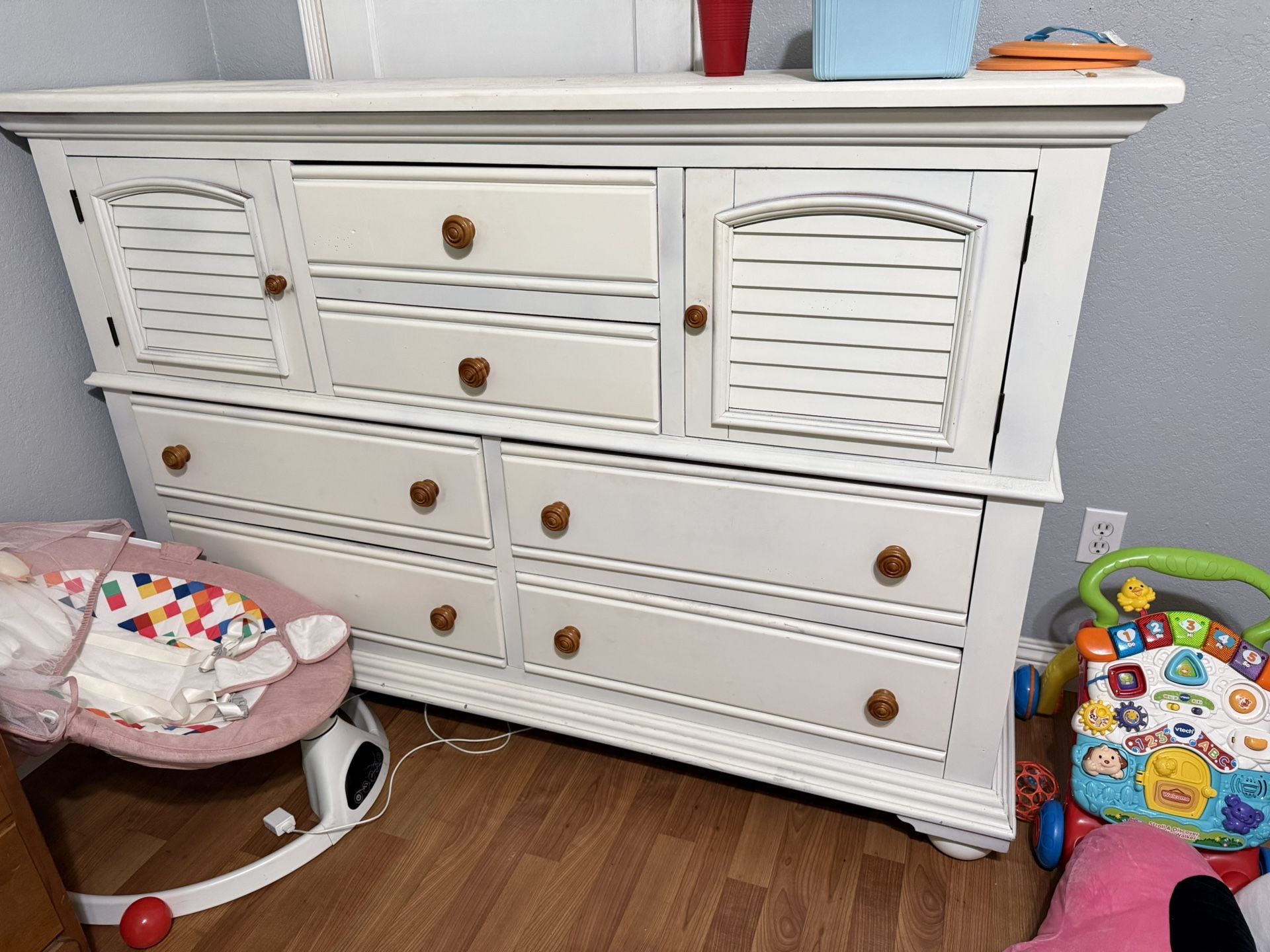 Needs some paint but is a solid wood dresser Height is 45 inches, length 67 1/2 and width is 19