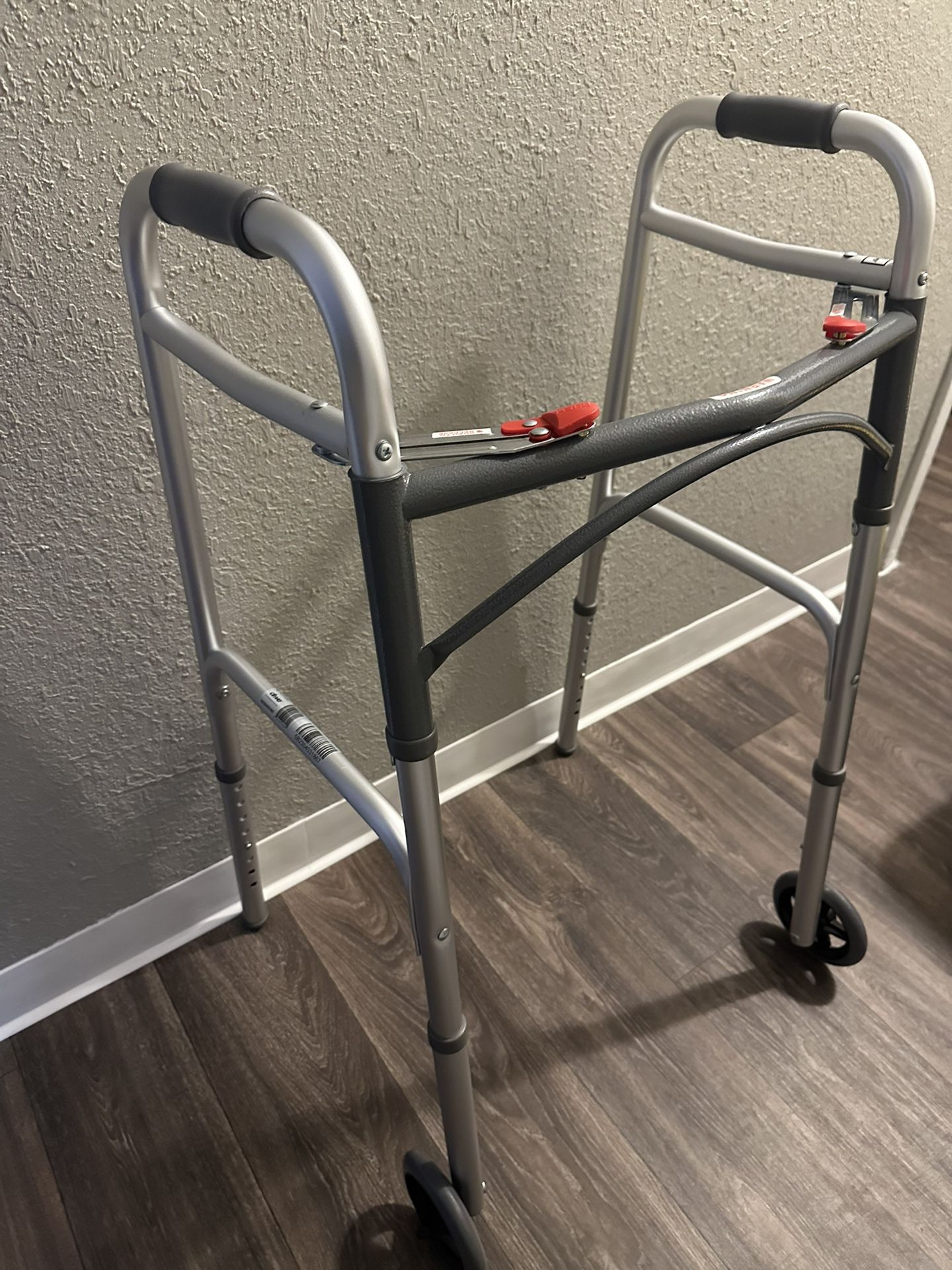 Folding walker with two wheels π on the front. Used for two weeks after a recent surgery. Excellent condition.