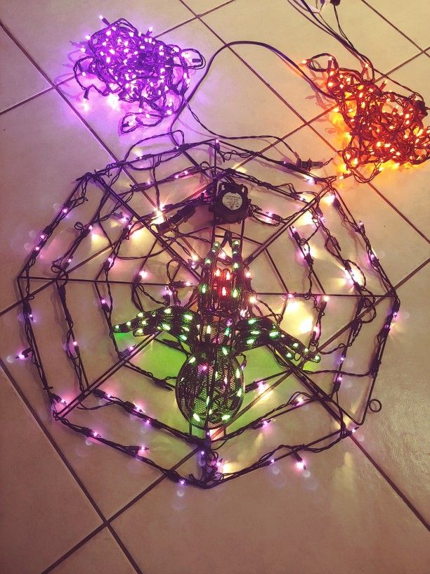 Big Spider, Spider Web. TIwo Orange and Purple Lights 20ft each