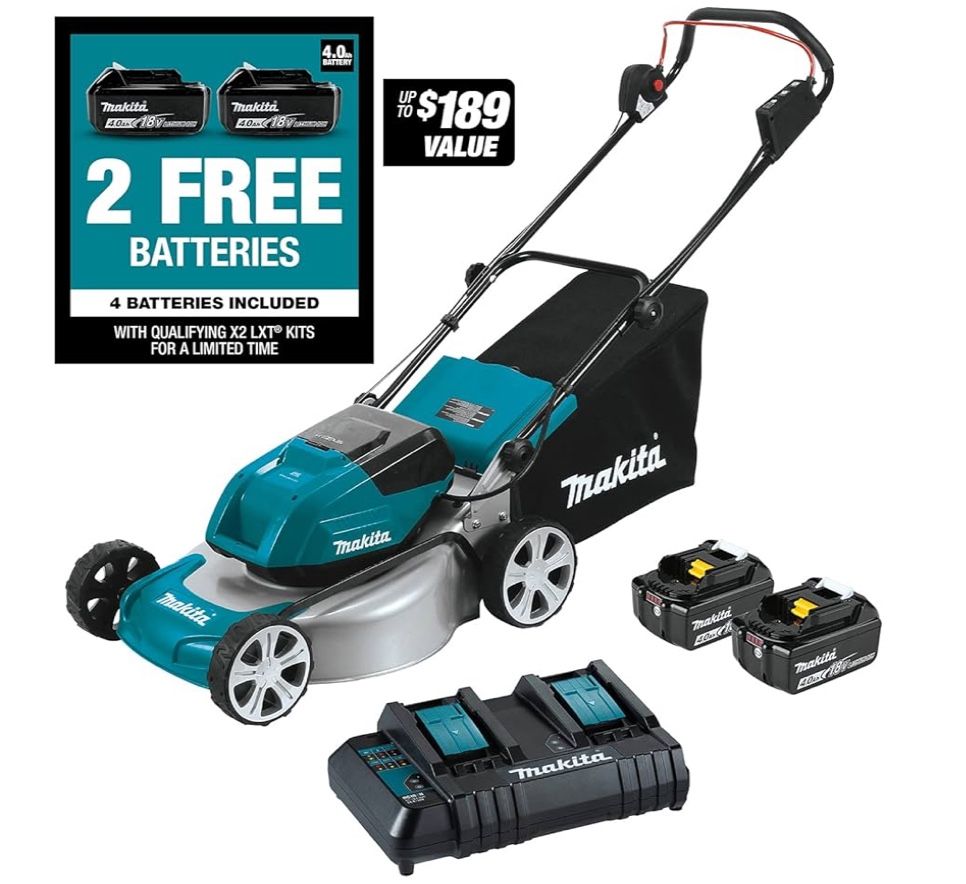 Brand: Makita Power Source: Battery Powered Material: Alloy Steel Color: Teal Style: Kit with four 4.0Ah batteries No gas, emissions, oil mixing or pull starts with reduced maintenance and low noise levels.Deck Width : 19".Rubberized soft grip handle bar for added comfort. Cuts over 1/3 acre in 43 minutes or less with four 18V LXT 4.0Ah batteries Commercial-grade steel deck BL Brushless motor delivers up to 3,300 RPM Quiet mode reduces noise by providing constant speed control at 2,500 RPM Cutting Height Range : 13/16" - 3"