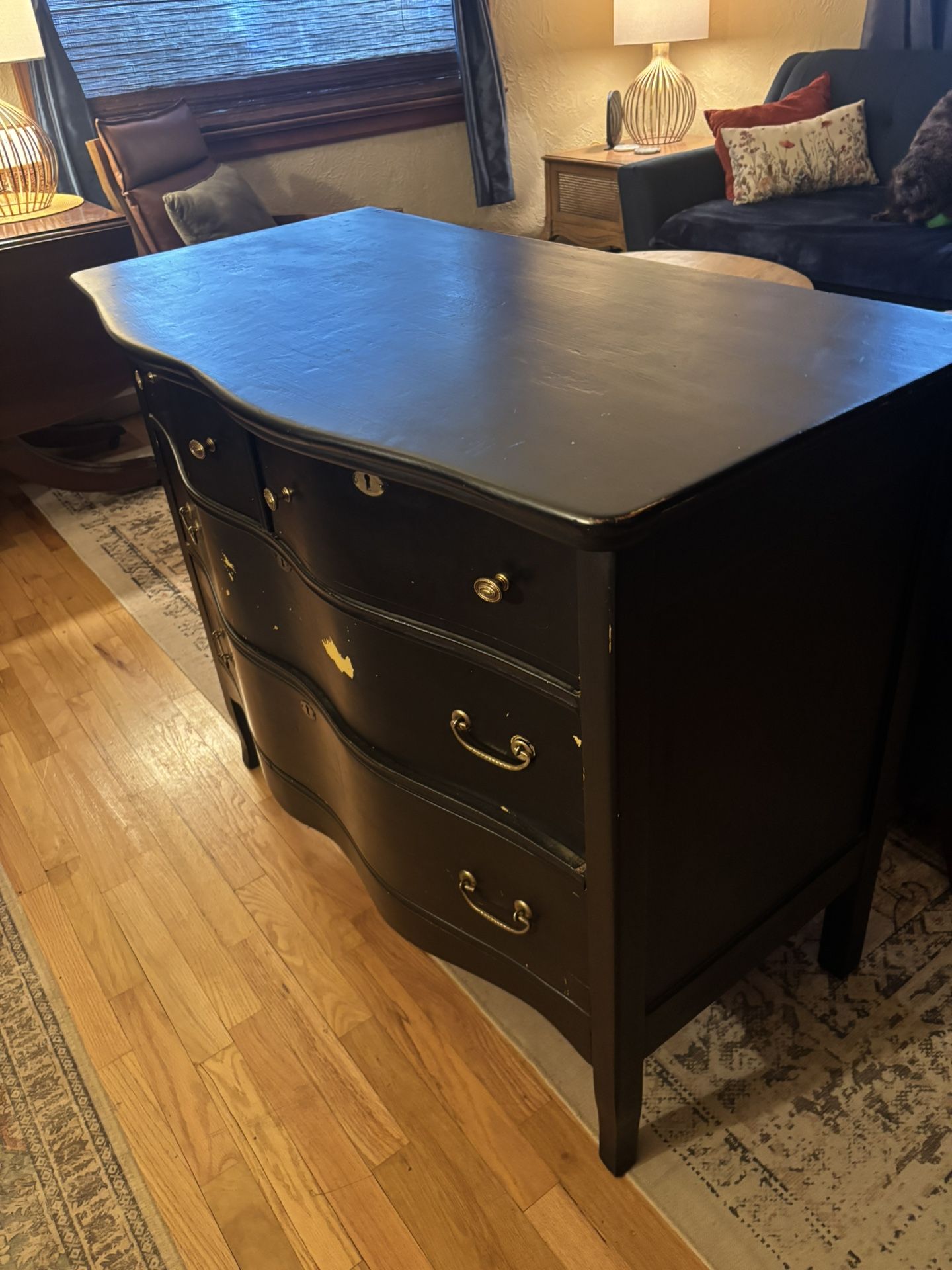 This is a solid wood dresser. Drawers slide in and out easily. Would be a great project or use just as is painted black I have no place for this. Otherwise I would keep it because it is a great quality piece. 42 inch wide 22 inch deep 35 inch tall