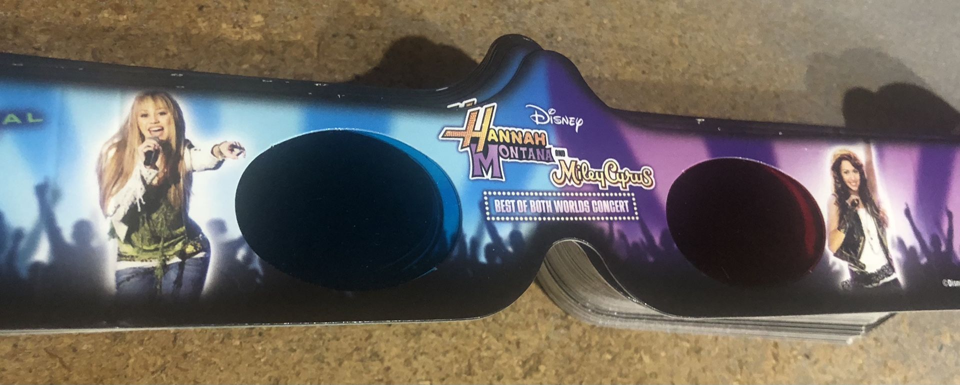 3D GLASSES from Hannah Montana Miley Cyrus Best of Both Worlds 2008 Disney Movie Concert - These are the movie theater's promotional 3D Glasses. NOTE YOU ARE BIDDING ONLY ON THE 3D GLASSES, NOT THE FILM OR DVD. NEW and Never Worn. Can sell more than 1 at reduced price. No exposure to smoke, dust, mildew, pets, fragrances or virus