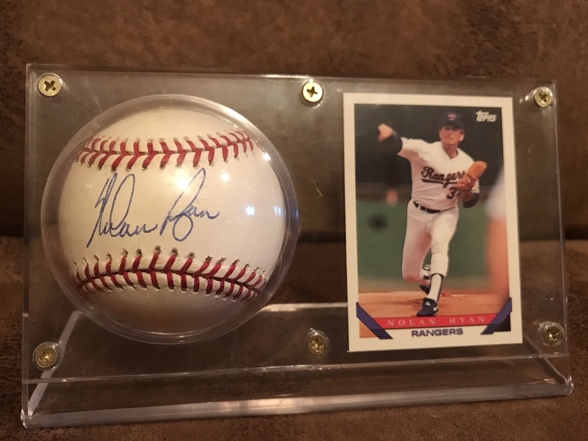 Set includes autographed baseball by HOF pitcher Nolan Ryan encased with Topps player card