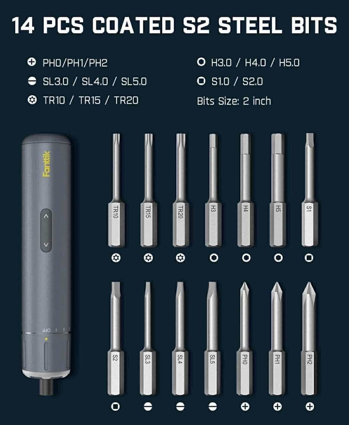 S1 Pro 3.7V Electric cordless Screwdriver, Power 14 S2 Steel Bits, 3 Torque Settings, Max 6 N.m, 2000mAh Battery, LED Light, 1/4''Hex