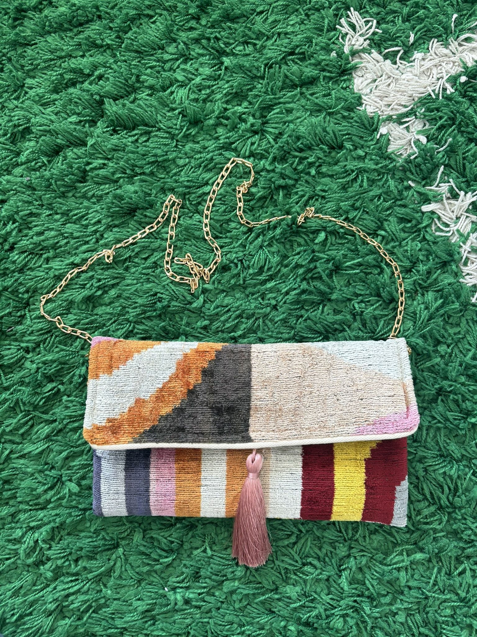 Cute little multicolor clutch purse with shoulder strap Soft towel-like material Measurements: 10.5” x 6” inches Preowned in excellent condition