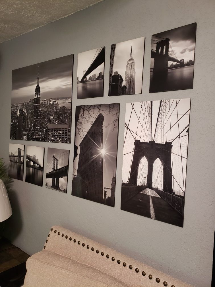 Set of 9 sights of the city. Includes: 1 hanging template, 6 pictures 9½x12⅝", 2 pictures 15⅜x25⅝" and 1 picture 32¼x25⅝". Price is firm.