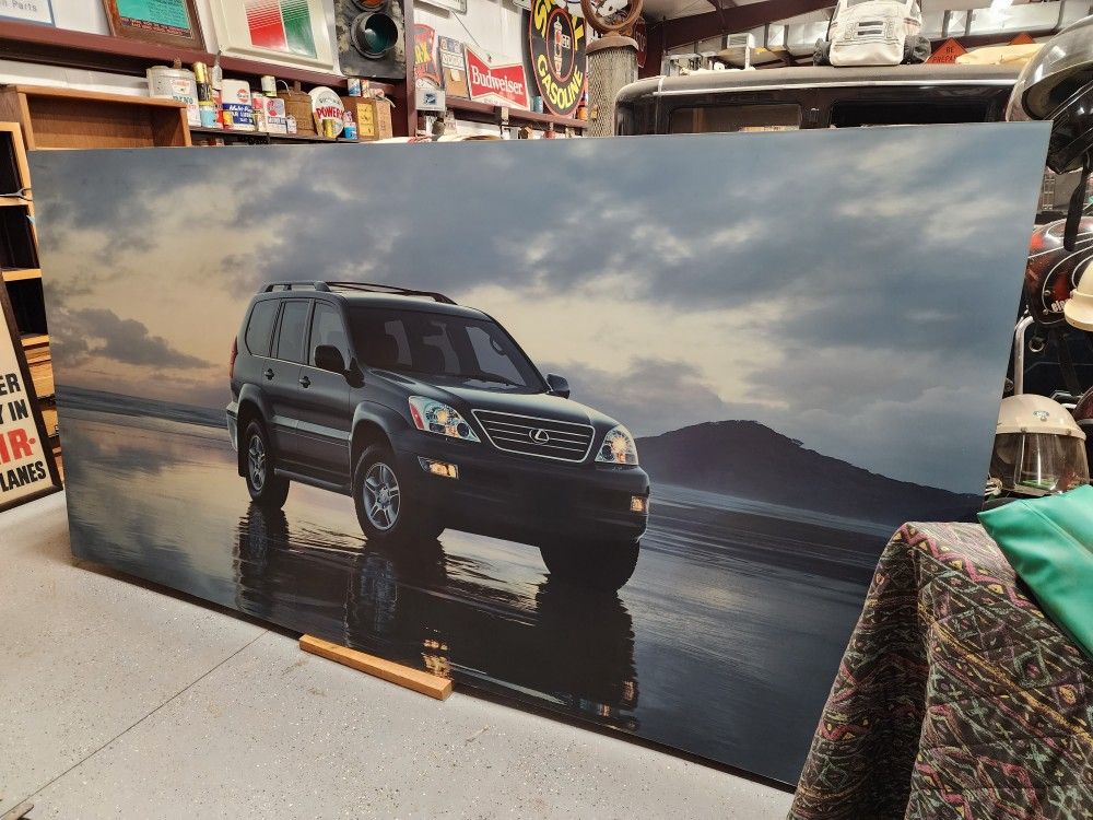 Large 10ft x 5ft Dealer Signage Lexus GX470 SUV Dealership Sign. Looks to be a 2003 to 2007 style. It is in pretty good shape for its age with just some wear. Made of a composite kind of cardboard/wood material with aluminum bracing on the back for mounting. Cool to hang in the shed, garage, man cave or repurpose in a cool way. $175 picked up in Buckeye, AZ