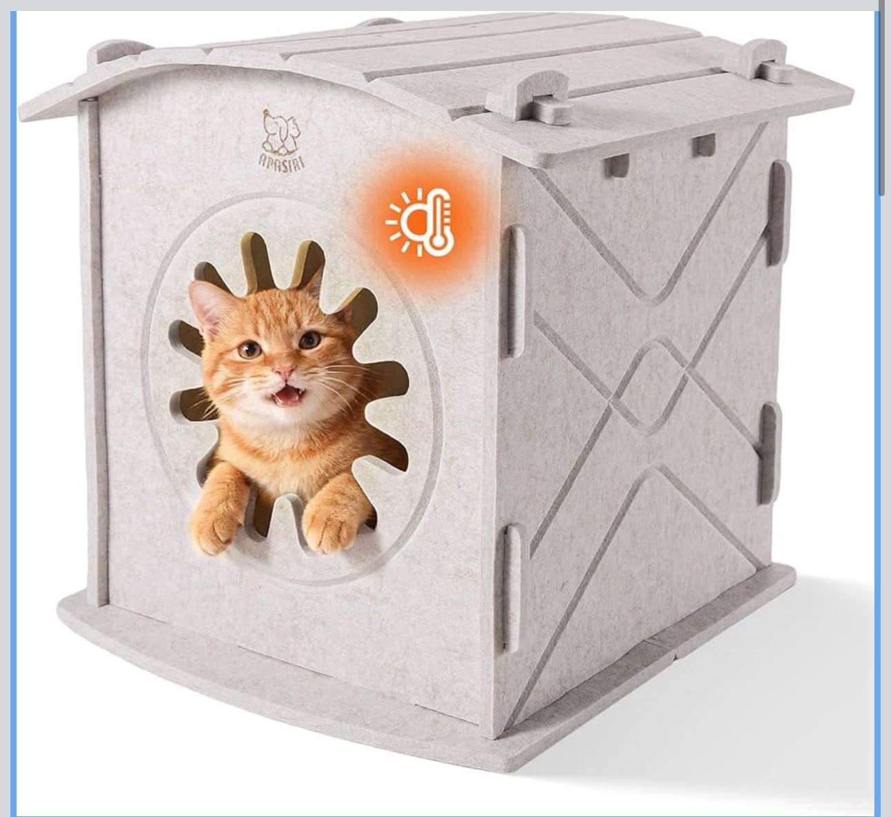 Apasiri Cat Houses for Indoor Cats: Felt Cat House Cave Cathouse, Scratch-Resistant Warm Insulated Covered, Hideaway Tent for Anxiety Relief Gift It's Time to Rethink New-Materials Cat House: Are You Ready? Keep Cats Warm Indoors: Built for indoor comfort, this warm cat house features advanced felt insulation that's denser and more insulation than standard cotton materials, Say goodbye to chilly paws! Our insulated cat house provides superior warmth indoors, using ultra-thick felt, ideal for keeping your feline warm and relaxed indoors. Comfort Size Like Mom's Arms: The indoor cat house's measuring exactly 13.4 x 13.4 x 9.85 inches. Why do cats love tight spaces?Because they remember being safe. This warm indoor cat house uses precise dimensions to recreate that early sense of belonging — every inch says “you’re protected,” just like when mom curled around them. Now with added insulation for winter comfort. Built for Claws Without Tears: Say goodbye to loose threads and tangled toes from cotton cat houses. Designed for real cat behavior, this durable cat house resists tearing and prevents claws from getting stuck — a safer, warmer shelter for indoor cats who love to scratch and snuggle, scratch-resistant material that lets them knead and dig safely, so your indoor cat stays warm, secure, and injury-free. Easy Clean: Say goodbye to messy wash cycles. Built for real life, this indoor cat house resists scratches and sheds, so cleanup takes seconds — simply brush off fur and debris with an lint remover. Easy clean never felt this quickly. Perfect Gift for Cat Lovers: Looking for a meaningful gift for a cat lover? This cat house combines style, comfort, and practicality, making it a cherished present for both cats and their owners. Designed with pet-friendly materials and a cozy interior, it quickly becomes your cat’s favorite napping spot. Ideal for birthdays, holidays, Christmas, or just because, it's a heartfelt way to celebrate the bond between pets and people. Hidden Cable Hole: Cat house features a specially designed hole for easy compatible heating pad (heating pad not included), keeping your feline friend cozy and comfortable in colder weather. Comfortable Raised Door: Soft and plush raised edges offer a satisfying surface for your cat to rub against and mark as their own. Suitable for Various Animals: Apart from cats, this cat house is also suitable for small dogs, rabbits, and other small animals in need of shelter. Engineered for Multi-Cat Homes: This sturdy cat house for indoor cats supports up to 35lbs with its reinforced structure. Perfect for play and rest, one cat can lounge on top while another relaxes inside, making it a feline-friendly entertainment paradise!