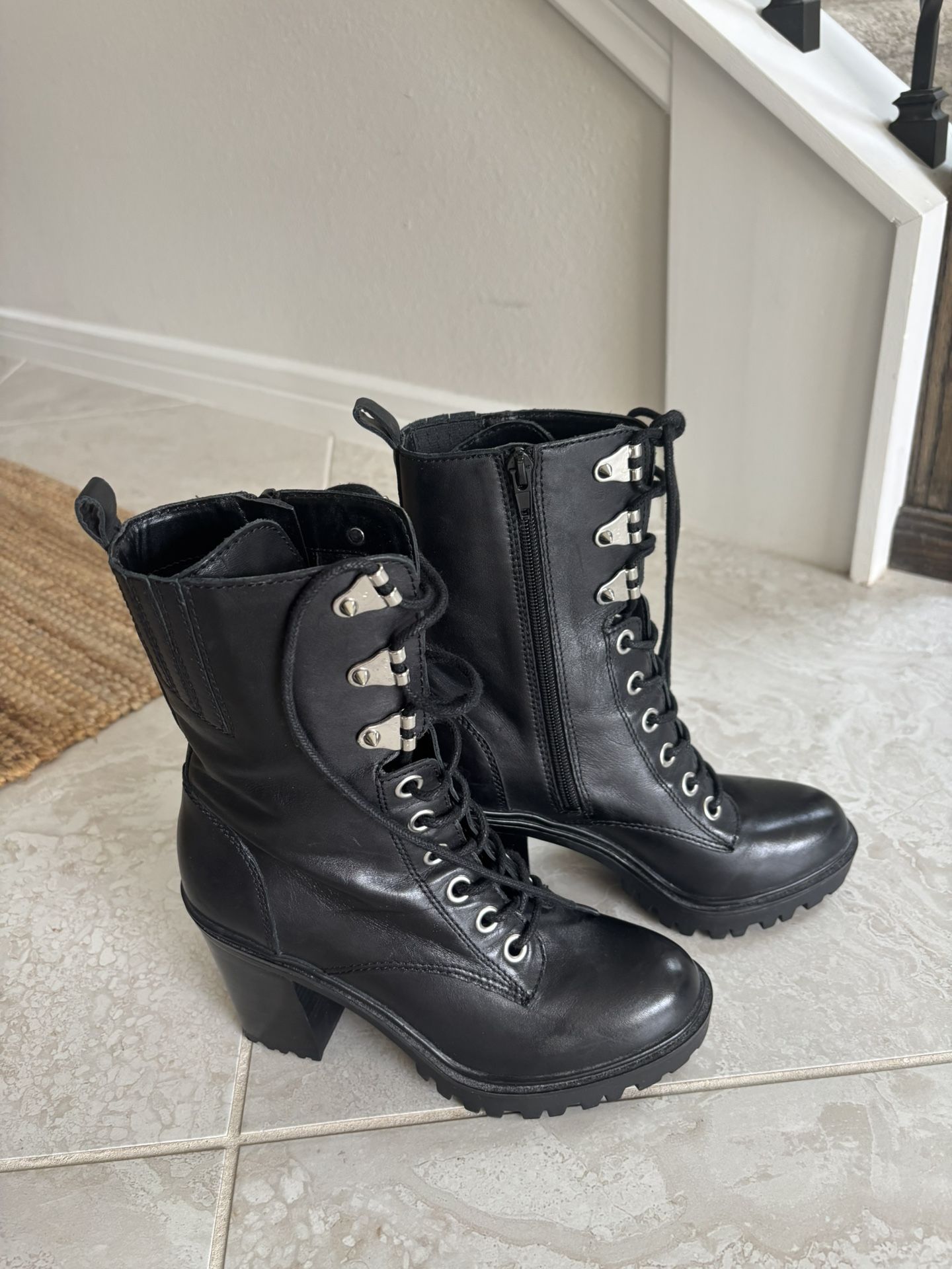 Perfect condition Only in the house before going to an event. Pretty much like new. lace-up front, a side zipper closure, and a chunky heel