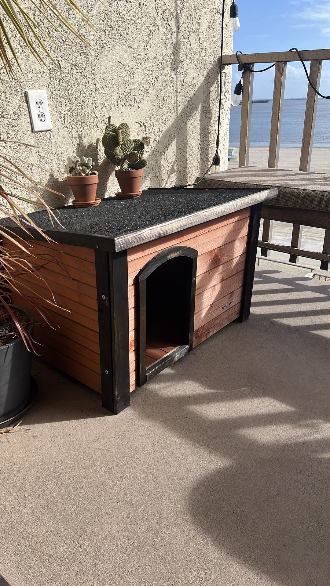 Selling wooden dog house- my dog literally never used it and never even went inside. It’s been sitting, so I’d rather someone else get use out of it! • Solid wood construction • Weatherproof / outdoor safe • Raised floor to keep moisture out • Slanted roof for water runoff • Designed for small dog breeds • Interior space approx. 29” W x 18.5” D x 18.5” H • Door opening approx. 12” H x 8.5” W It does have minor sun fading on the paint from being outdoors, but nothing structural at all — just cosmetic and easily touched up if you care to. The wood itself is solid and sturdy. Originally purchased from Amazon fully built. It’s in great condition overall — just taking up space at this point. PICK UP ONLY