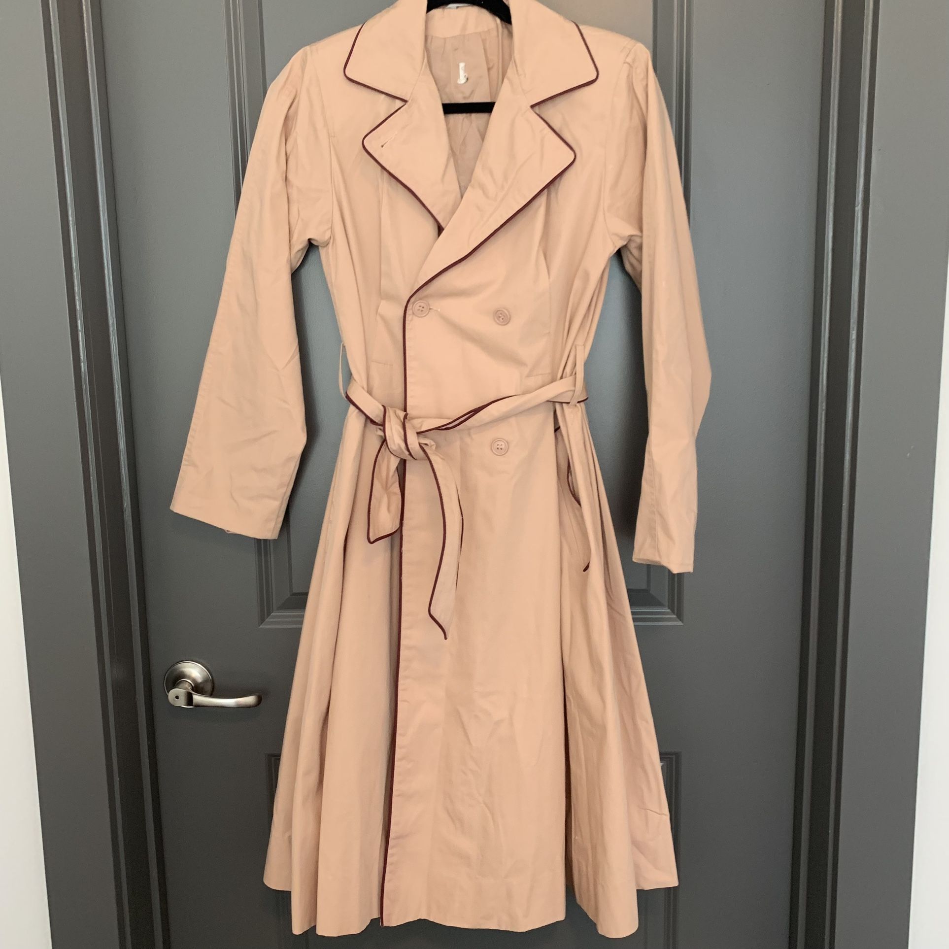 70s VINTAGE pink trench coat Vintage size is a 8 but it fits more like a 4 or 6 / small or medium. I am a size small or 2/4 and it fits me well. This beautiful trench coat is a dusty rose color (Best demonstrated in the first few photos) with a burgundy red wine trim. It includes a belt, two pockets and 3 buttons in the front, as well as shoulder pads to complete the vintage look. Fabric is made of 60% cotton and 40% polyester in the shell, the lining is 100% nylon. It's in really good condition. Only things to note is a small amount of discoloration I noticed on the sleeve, and around the cuffs. Made in Hong Kong From the 60s/70s is a rare find!