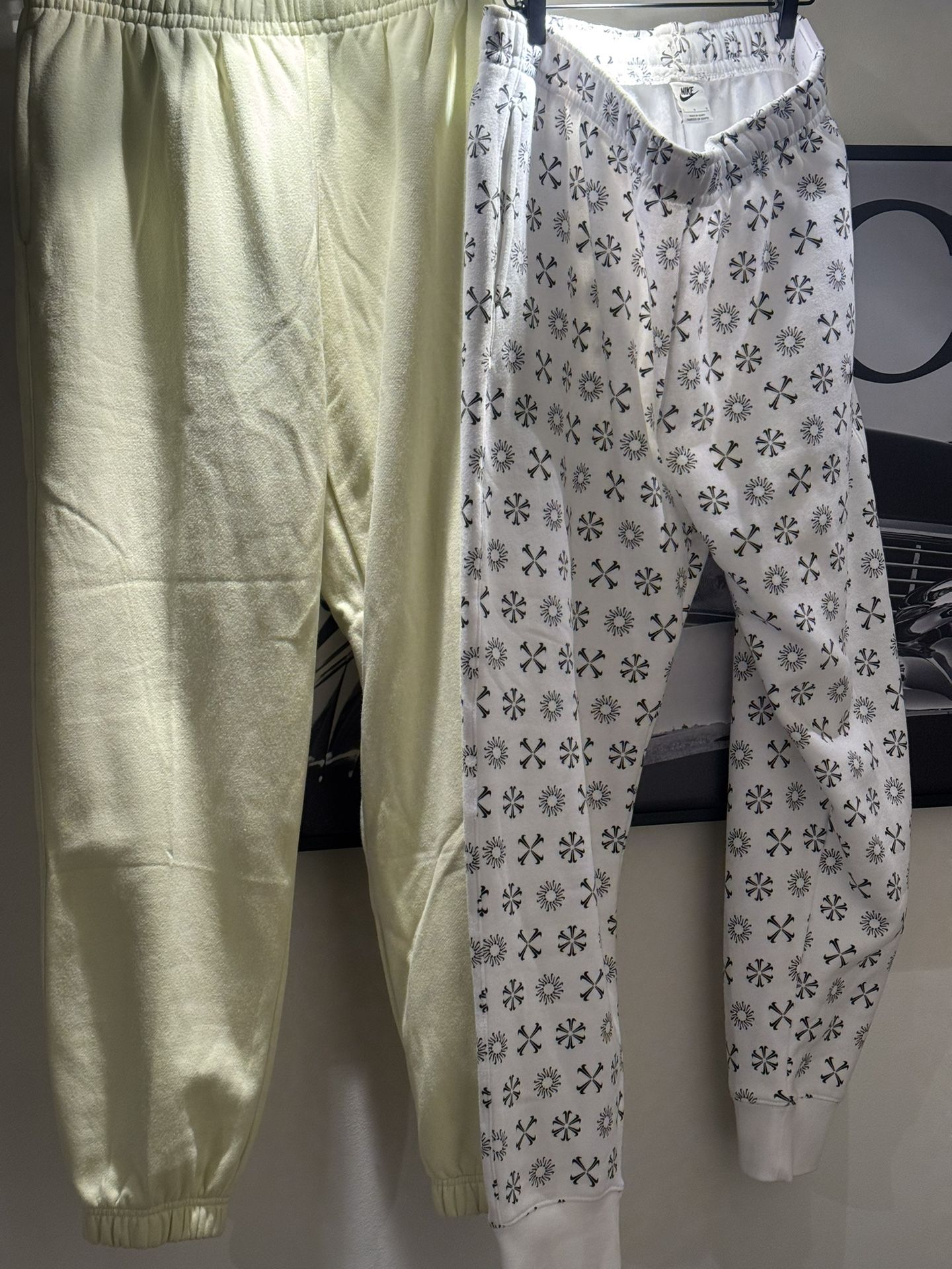 Selling two brand-new pairs of Nike men’s sweatpants, both size Large, new with original tags attached. Includes: • Nike yellow sweatpants – size Large, classic embroidered Nike logo • Nike white sweatpants with black all-over graphic print – size Large Both pairs are unworn and in excellent condition. Soft fleece feel, elastic waistband, comfortable relaxed fit. Retail on tags: • Yellow pair: $60 • White/black print pair: $65 Selling as a bundle. Local pickup preferred. Cash or OfferUp payment.