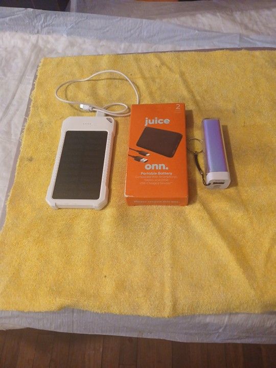 1 NIB juice onn portable battery. usb and usb-c charging ports. 1 used solar power portable battery w/2 charging ports. 1 used keyring portable battery with 1 charging port DC 5v