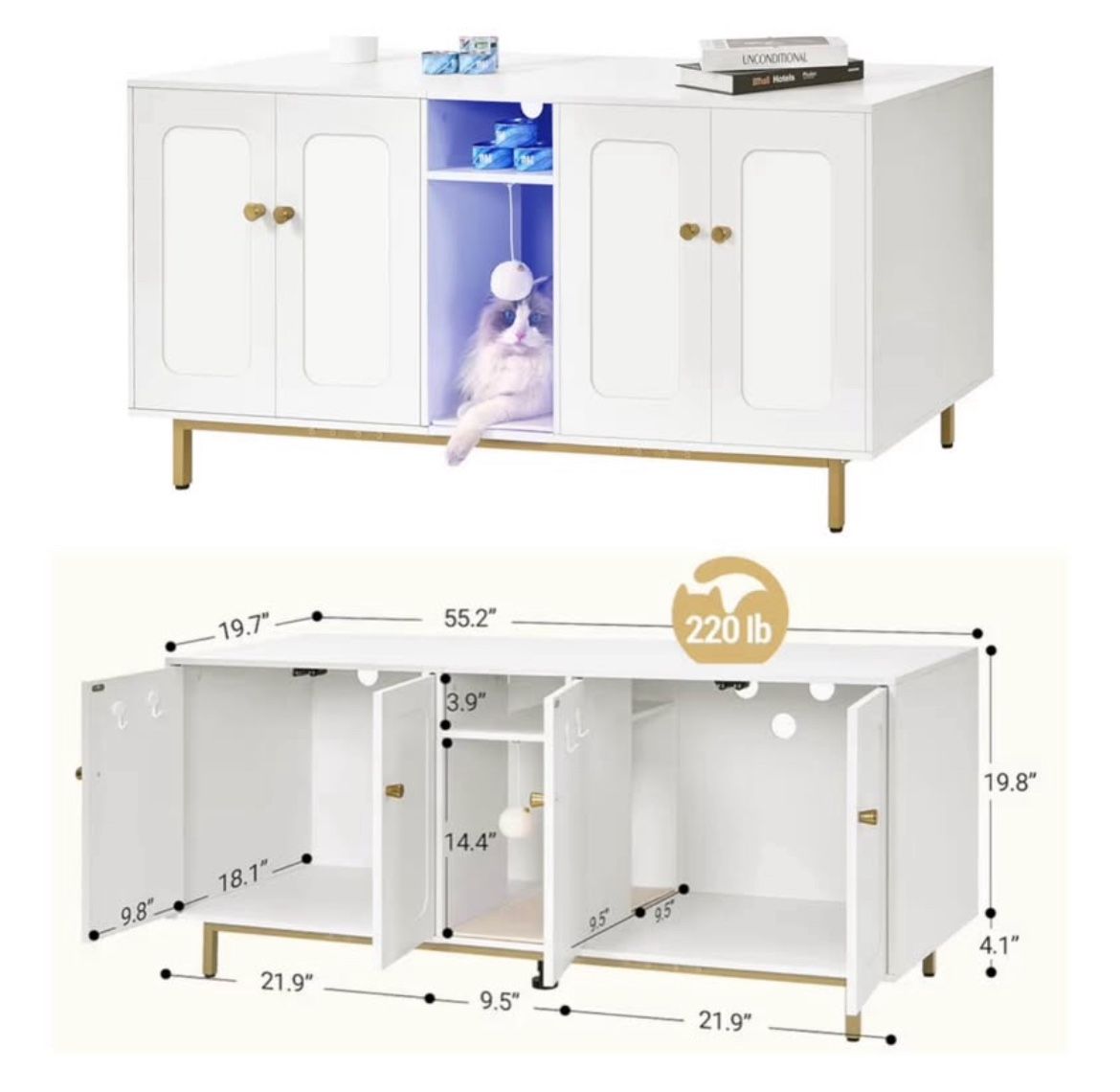White, Silver legs. Used, in good functional condition. See images. For pickup. Fits Most Litter Box, 55.2L x 19.7D x 23.9H. Price firm, no offers.