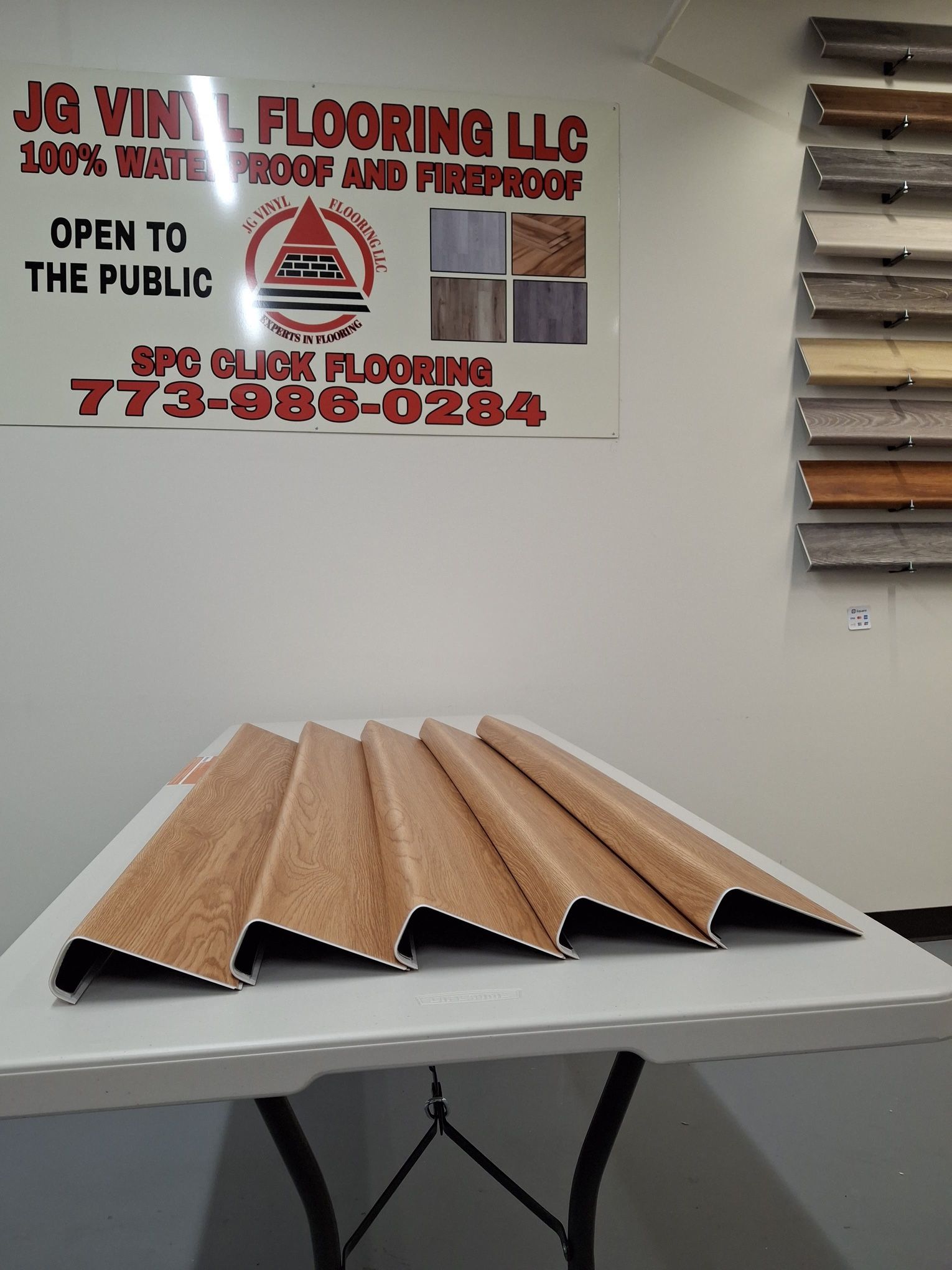 Give your home or business the ultimate look of luxury with Spc click flooring very easy to install, we have over 100,000 square feet in stock flooring starts at $1.99 -$2.09 a square foot.We also do stairs that match your flooring. We can mold your flooring material for only $20pc to match your existing floor, or you can choose from our color selection to best match your floor for $30pc. You can choose between a square nose or 90 degree nose. We offer quick turn around time most jobs will be completed same day.