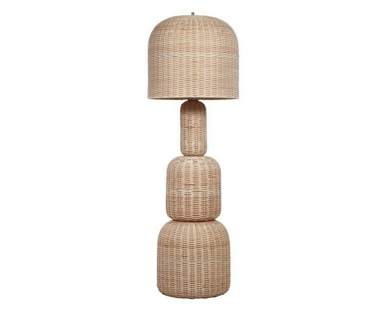 Skillfully handwoven of textural natural rattan, the dreamy Grace floor lamp crowns a stacked pedestal of rounded tiers with an oversized dome shade. An iconic mood light with a sculptural form, this standing lamp refashions the tropical beauty of organic natural fiber into an on-trend contemporary silhouette. Curvy yet compact with a tactile dimension, Grace illuminates with a softly filtered glow that warms up the ambience of any room.