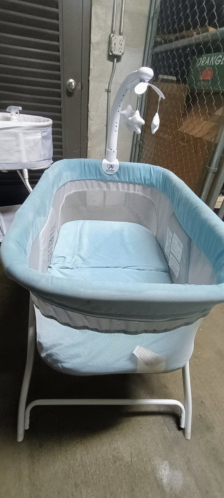 Blue baby bassinet by Dream On Me comes with matching mattress and washable, removable cover. Easy fold, easy storage, light weight , easy to manage.