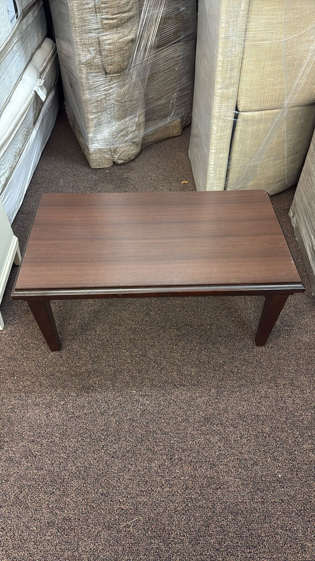 Beautiful solid wood coffee table. It’s dark with a dark cherry/mahogany (almost) finish that just screams class! Dimensions are 42”x24”x19”