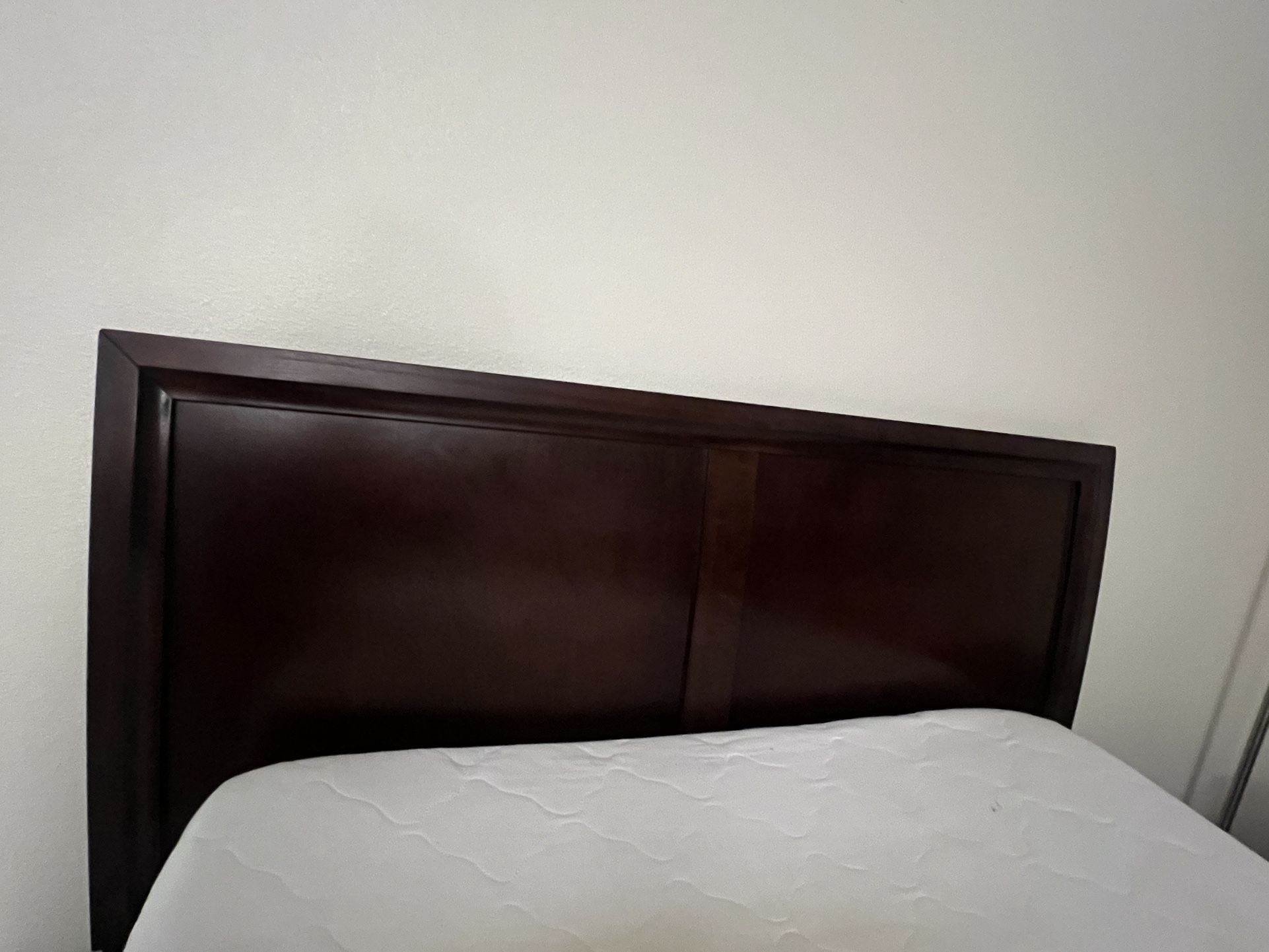 Wooden queen bed frame, mattresses, nightstand, and dresser with mirror.