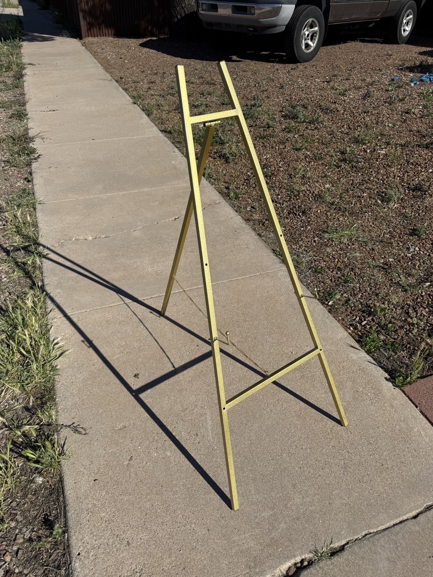 Decorative gold metal ease. $27. New, never used. Great for weddings. Adjustable angle. 41 inches high with extended. Three height adjustments. Lower display setting is a 12 inches. Second setting is 18 inches. Third setting is 25 inches high. ><> All offers will be considered. We are located at Broadway and Camino Seco. Cash only. Pick up only. HE>i