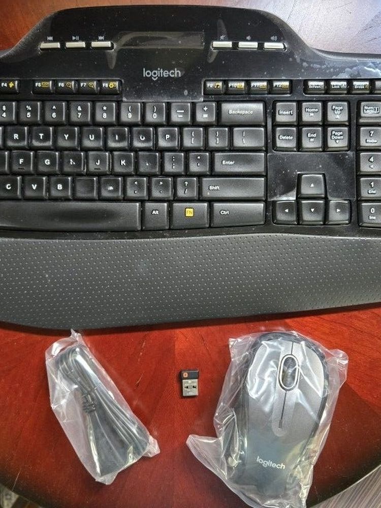 Logitech MK710 Wireless Desktop Set, Keyboard and Mouse Keyboard has been used with some keys identity faded from use Mouse is new and never used Will need batteries • Sold as 1 Each. • Keyboard includes comfortable, concave keys with softly-rounded edges. • Sleek, low profile keyboard with cushioned palm rest. • Sculpted mouse for greater comfort in use. • Mouse includes hyper-fast scrolling capability. Currently $78 on Amazon and lists for $99