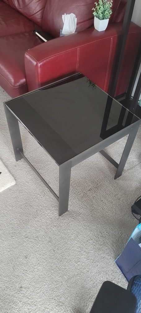This sleek design works great next to any couch, or even as a standalone piece. It's a sturdy build with a solid metal base of gun metal/gray and a thick glass with black color base on top. Dimensions : 20"x20"x20" (WidthxDepthxHeight) You will be getting 2 of these side tables. PS: I am also selling the matching coffee table separately, if interested please check out that listing from my page. Thanks!