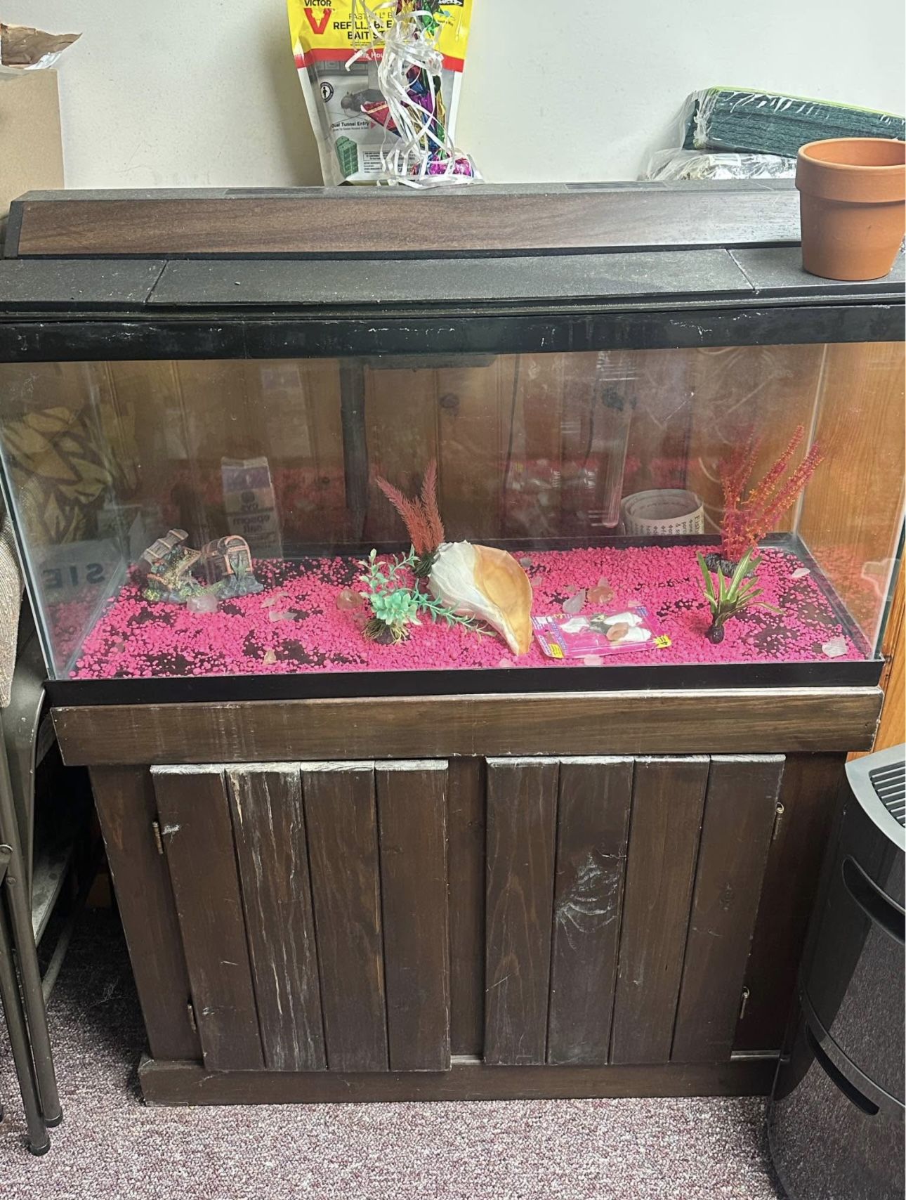 30 gallon fish tank! The stand is cool as you can see it offers as storage underneath Sold as is, as you can see the stand will probably need to be cleaned