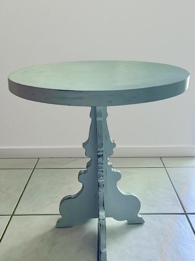 Farmhouse Style Baby Blue Side Table - Distressed Finish This adorable side table brings a touch of farmhouse or cottage style to any space. It's vintage, hand-painted in a soft baby blue, and boasts a perfectly distressed finish. Great for adding character! > Dimensions: 22.5 inches tall, 19 inches diameter. > Available for local pickup in Longwood FL