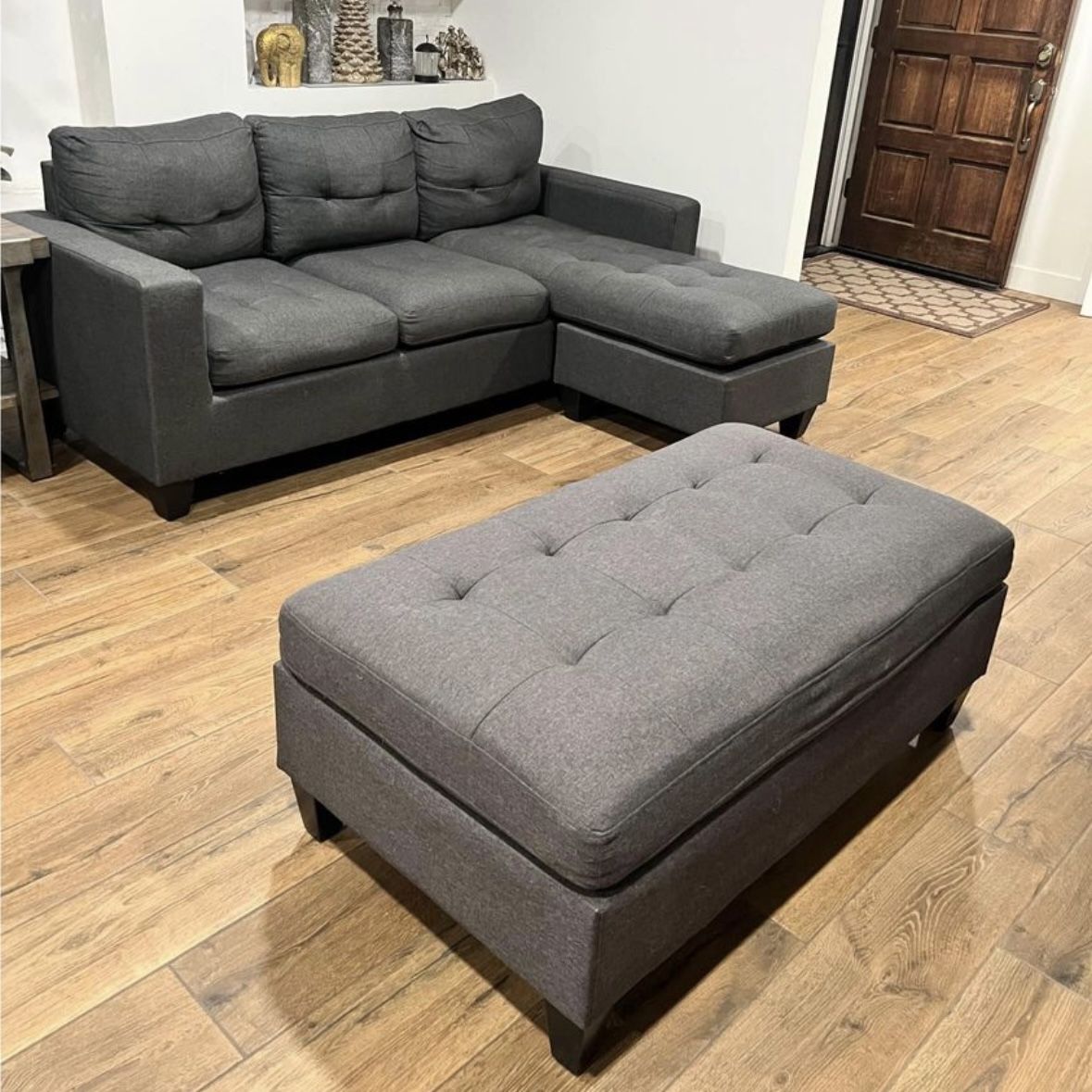 Selling My Gray Modern Reversible Tufted Sectional Sofa Set. Comfortable Back and Seat Cushions, Smooth Tufted Fabric, Reversible Chaise, Additional Ottoman. Excellent Shape. Original Condition. Clean. Pickup in 92109 or Delivery with Zipcode. Dimensions: 80in Long, 58in Chaise, 32in Deep, 29in Backrest, 18in Seat. 45in by 26in Ottoman.