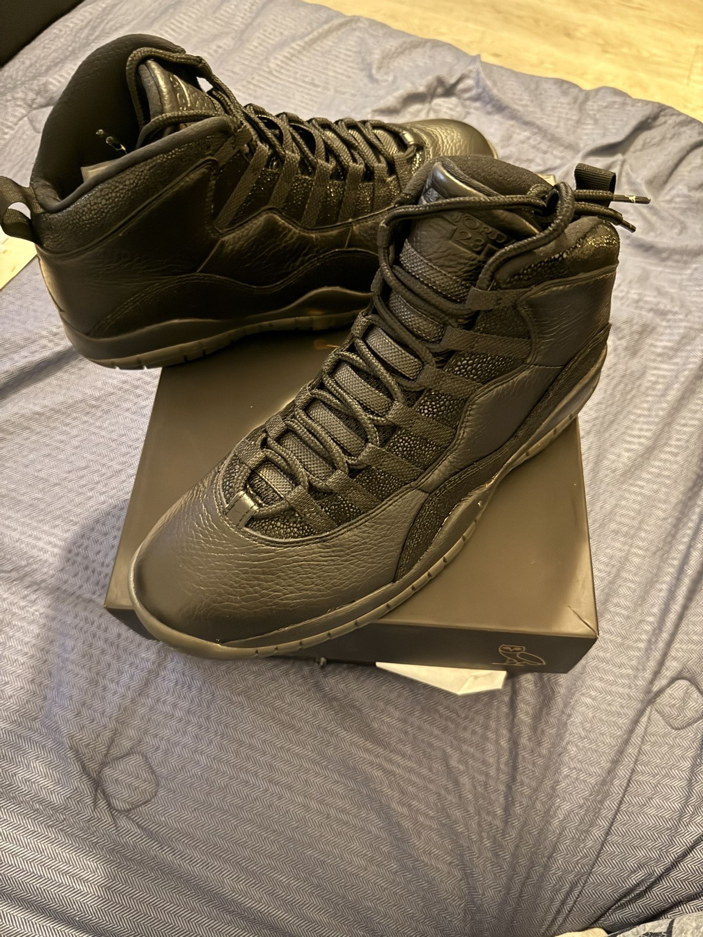 Size 11 - OVO x Air Jordan 10 Retro Black Brand New Drake The product is a size 11 OVO x Air Jordan 10 Retro Black, featuring the iconic retro silhouette of the Jordan 10 model. This limited edition sneaker collaboration with Drake's OVO brand released in 2016, showcases the classic black colorway with subtle design elements unique to the collaboration. As part of the Air Jordan product line, this athletic shoe is sought after by collectors and fans of both Jordan and Drake. Asking $280