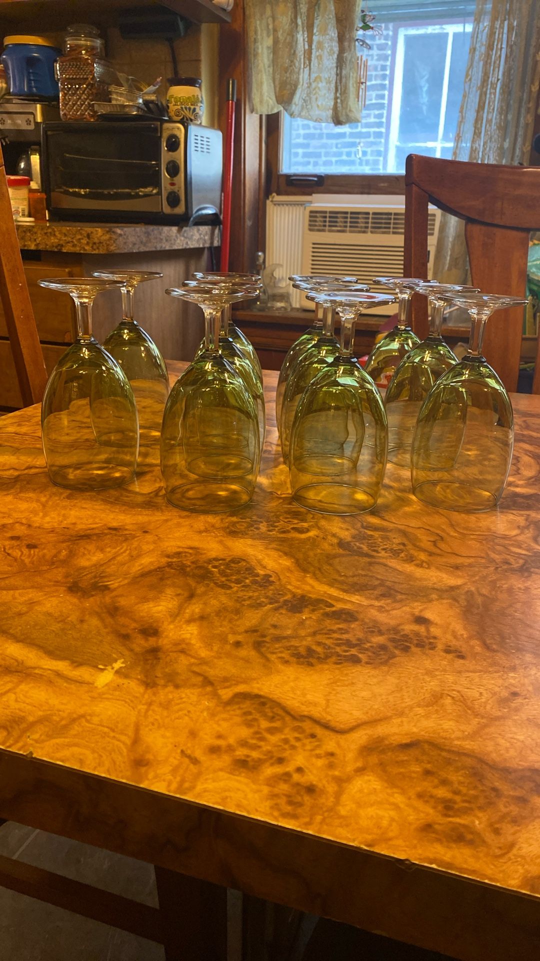 Suitable for serving beverages like water, wine, iced tea or other drinks. Sturdy base, wide bowl. 7” tall approximately 3” wide, 16 oz.