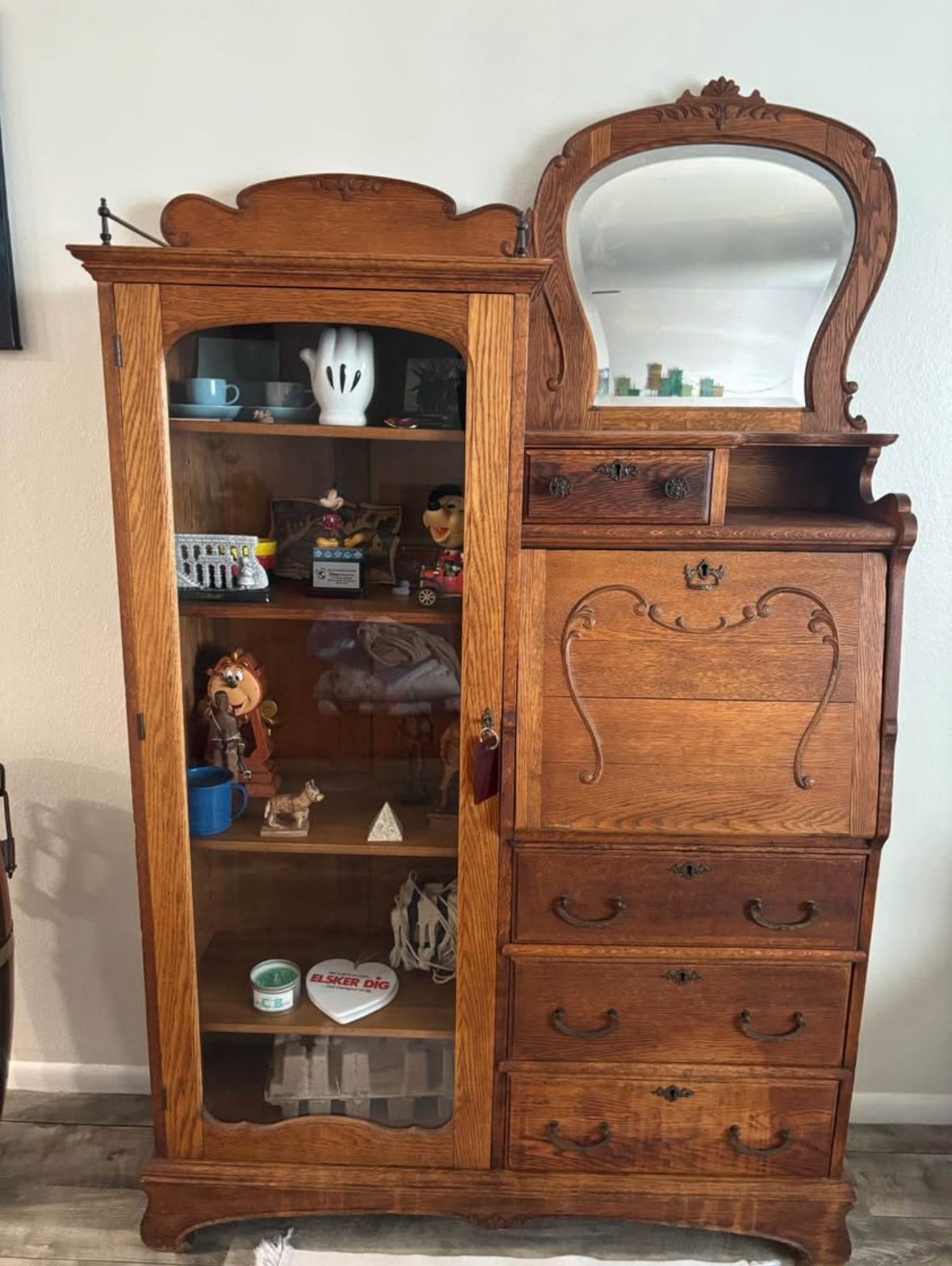 Cabinet is in great condition. There is some discoloration in the finish on the right side near the bottom as seen in photo. Beveled mirror. Key included. 40” wide and 70” tall at its highest. Asking $250 OBO.