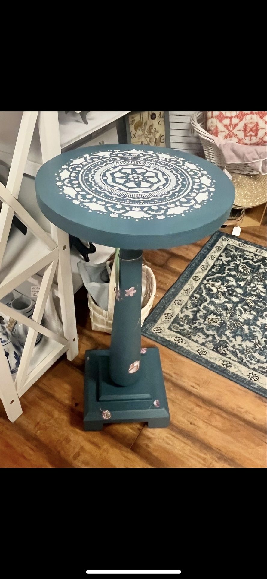 Small Blue and Floral Table with Mandala Perfect for your plants, to use as an end table, or as a small table for your mini Christmas tree! 14”x28” Available at “The Elephant’s Trunk” in Chester, VA Call/message me or the store to make sure it’s available. My is booth @thriftytreasuresupcycled located in the back room to the left when you walk in. I sell home decor, beauty products, jewelry, seasonal decor, vintage and more! Please feel free to reach out if you have any questions:) The Elephant’s Trunk hours SUN 10-4 Mon- Sat 10-6 Location: 10410 Iron Bridge Road, Chester, VA 23831 Phone # (contact info removed)