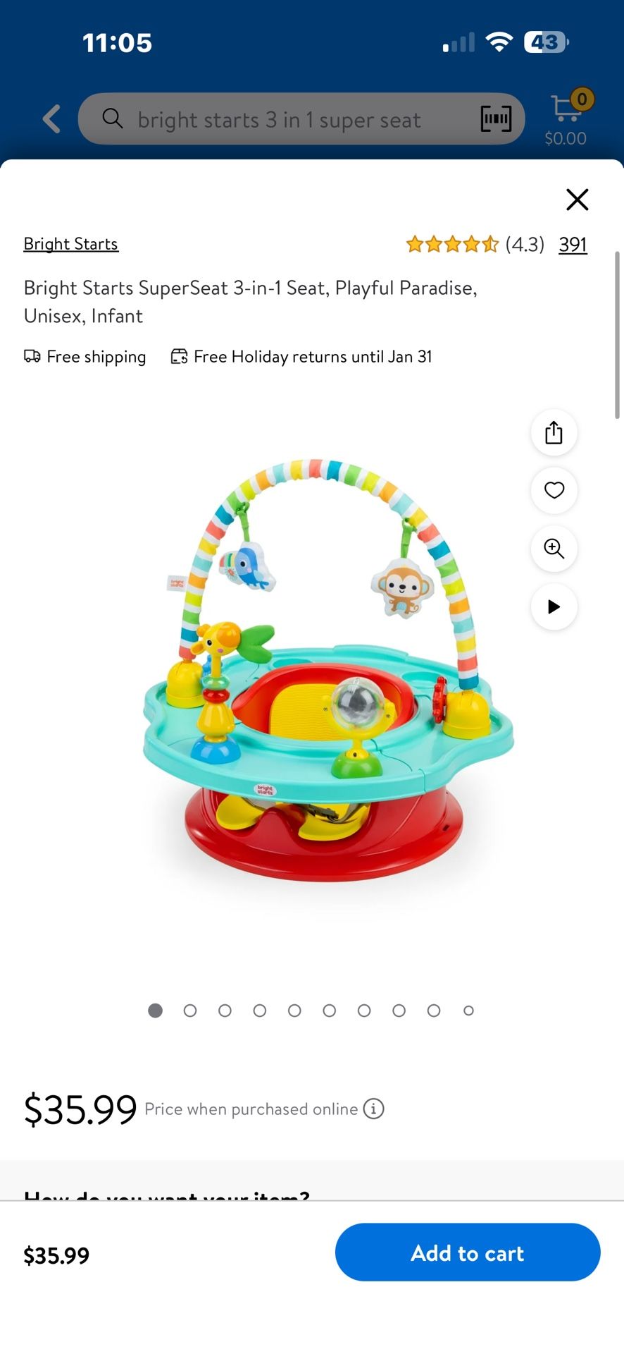 I have this exact Bright Starts SuperSeat. My daughter didn’t care for it so it was only used a couple times & it sells for $35.99 @ Walmart & I’m asking $25 obo. It has all the attached toys besides the 2 plushies that hang up top as pictured. I will clean it up for you before meeting as it’s been in storage. Located in Danville IL