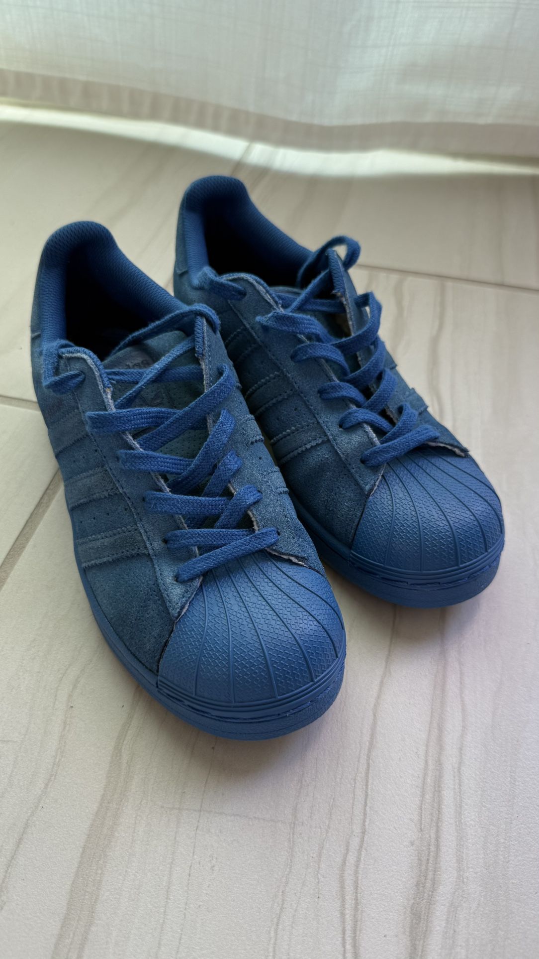 Authentic sneakers from Adidas. This is the iconic Adidas Superstar from the 2015 "Tonal Suede" pack. This model features a full premium suede upper, the classic rubber "shell toe," and a striking monochromatic "All Blue" (Bluebird) colorway where every part of the shoe is blue Key Details: ๐ท๏ธ Brand: Adidas ๐ Model: Superstar ๐ข Style Code: AQ4169 ๐ Size: US 6.5 (Men's) / EU 39 1/3 โ๏ธ Sizing Note: This is a Men's size 6.5, which is equivalent to a US Women's size 7.5. ๐งต Materials: Suede Upper, Rubber Sole ๐จ Color: Blue / Bluebird (Monochromatic) โจ Distinctive Feature: Classic rubber shell toe, full tonal suede upper. ยฎ๏ธ Logo: Adidas Trefoil logo on the heel and tongue. ๐โโ๏ธ Sole: Rubber cupsole with herringbone pattern Condition: โ ๏ธ The sneakers are pre-owned (used). They show normal signs of wear (e.g., some fading/wear on the suede). ๐ฏ Authentic. Please carefully review all photos ๐ธ, as they are an integral part of the description and accurately reflect the current condition of the shoes. ๐ฆ Please note: The original box is not included