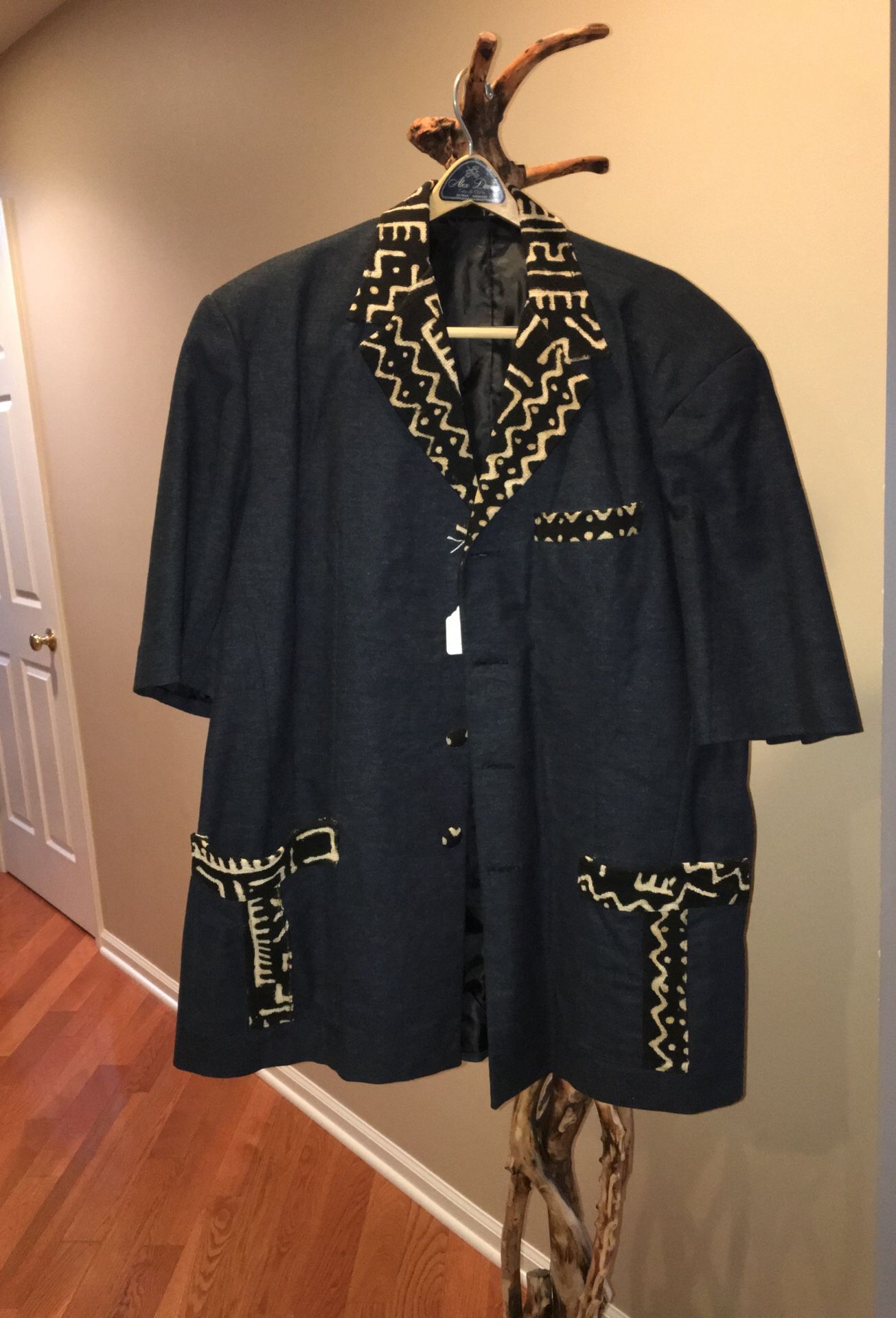 Extra large men’s authentic African short sleeve shirt or jacket from Ghana wear a black turtleneck underneath in the winter it’s 100% cotton never use new has kick pleading in the back also has shoulder pads