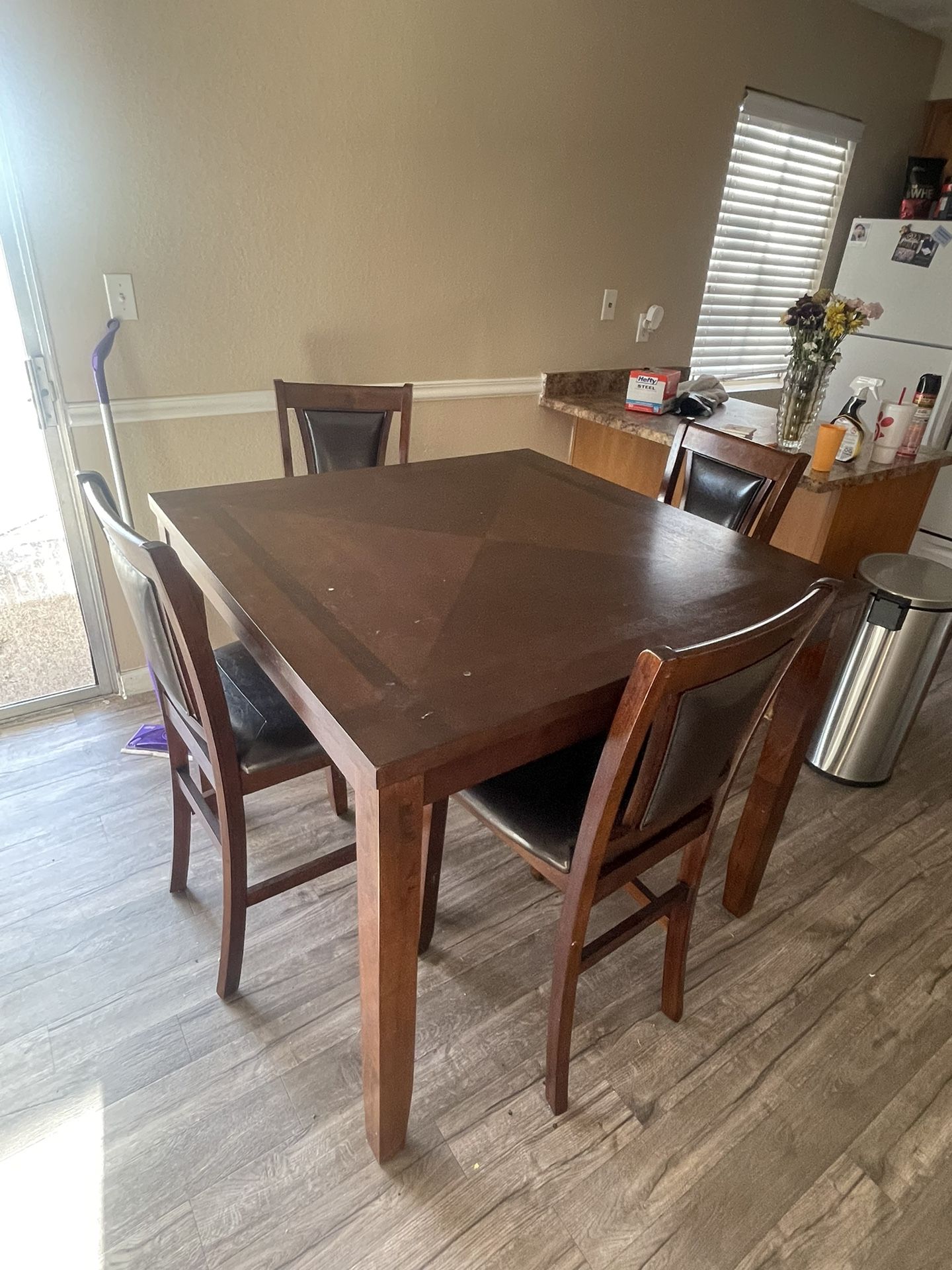 Tall kitchen table, all brown Comes with 4 chairs, 1 chair cover does come off. Pretty good condition Send OFFERS