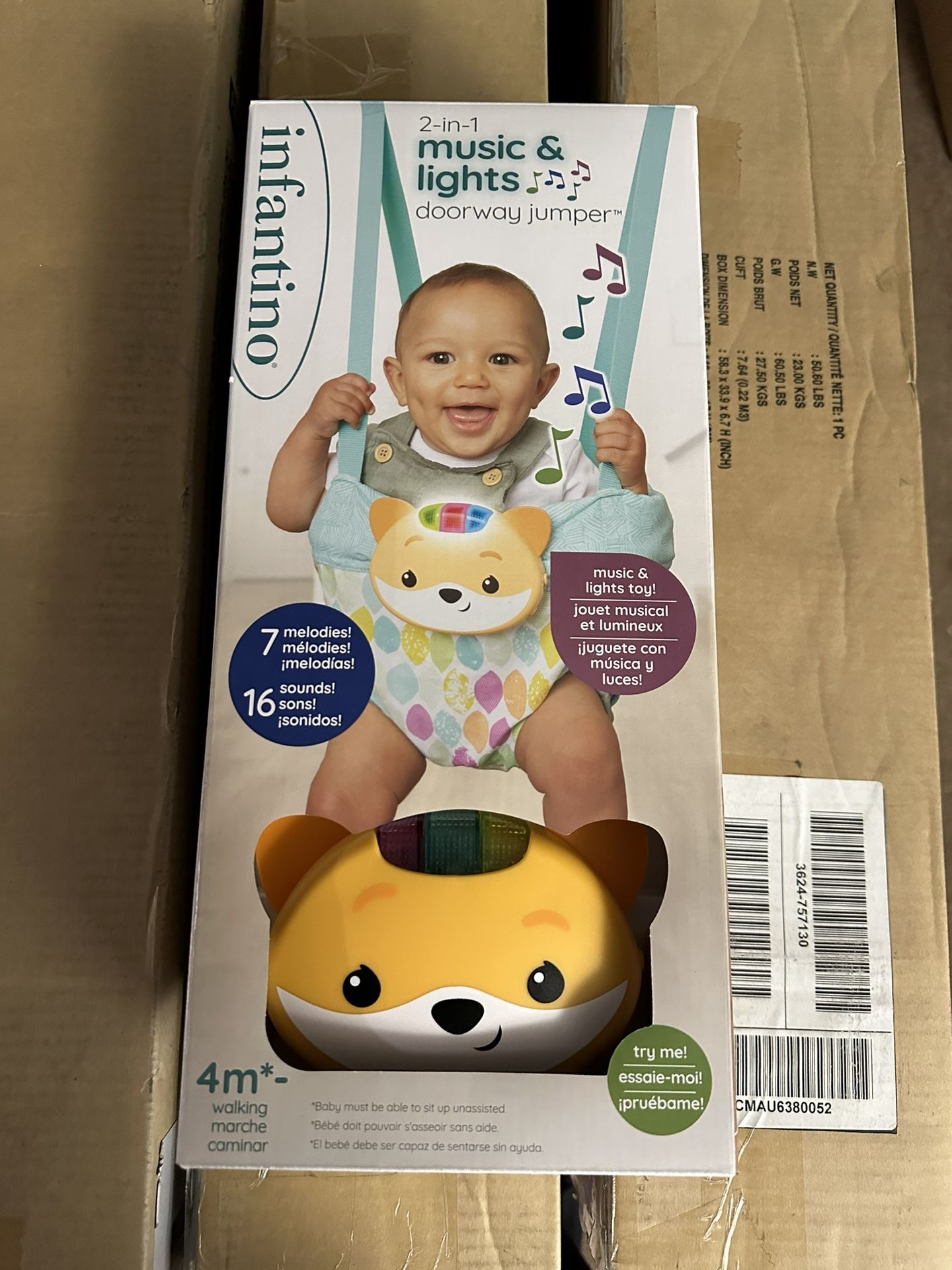 Quantity Available 3 @ $25 Each Your Wee Wild One will love being active in the Infantino 2-in-1 Music & Lights Doorway Jumper, Multicolor Fox. Keep your little one entertained and engaged with motion-activated sounds and lights, encouraging them to jump, bounce, and play. With upbeat music and colorful lights, your baby will be filled with joy and excitement. Easily move the jumper from room to room with the convenient doorway clamp, always keeping your baby in sight. When playtime is over, the lightweight design makes it a breeze to pack and store. The soft seat is even machine washable for easy care. Adjustable straps ensure a perfect fit for your baby's height, and wide-set straps allow easy access in and out of the jumper. Detach the musical toy and take it on the go for even more fun. Give your baby a bouncing experience they'll love with the Infantino 2-in-1 Music & Lights Doorway Jumper. • Boost your baby's physical development with exciting bouncing and jumping activities that promote gross motor skills • Immerse your little one in a world of interactive music and captivating lights with the motion-activated fox toy that springs into action with every movement • Effortlessly get your baby in and out of the multicolor jumper with wide-set straps for ultimate convenience • Ensure your baby's comfort with the soft and machine-washable seat for easy cleaning • Easily attach this jumper to most doorway frames for convenient use throughout your home • Detach the musical fox toy and keep the fun going anywhere • At Infantino, we believe every baby deserves access to quality products, this is why we design our products to be unisex so all little ones can enjoy them