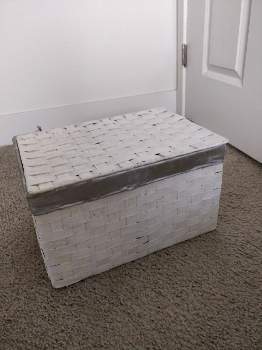 Fabric lining plastic wicker shelf storage box with lid. Measurements - 15 L x 11 W x 9 H inches. Used in good condition. Cash only
