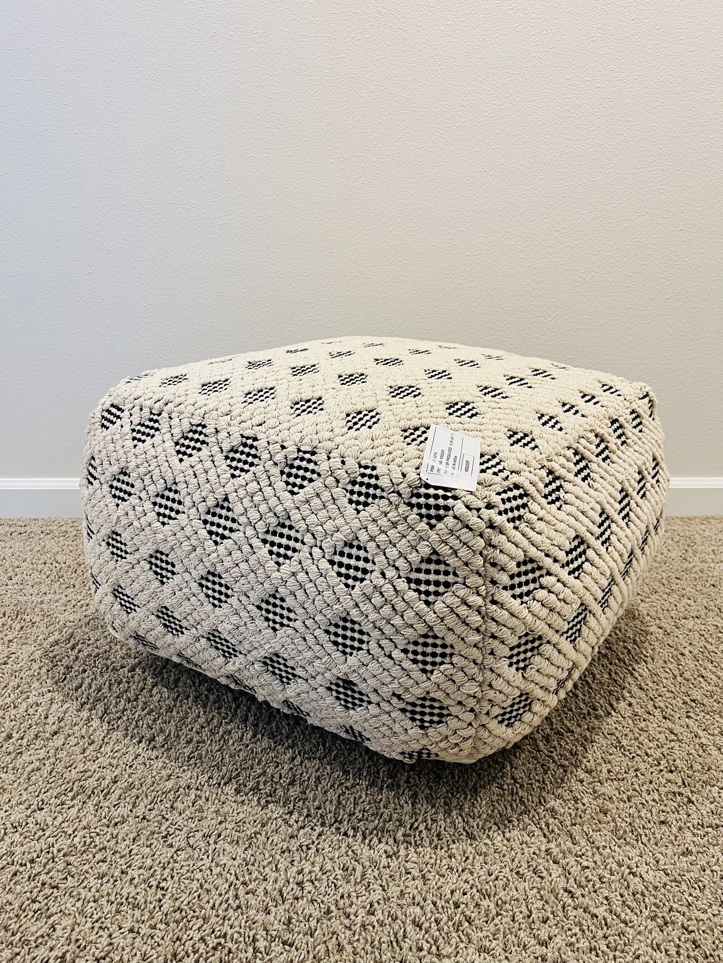 PRODUCT DETAILS 20"W x 20"D x 12"H Weight: 8 lbs. Weight capacity: 100 lbs. 12-in. seat height Outer cover: cotton; Inner shell: cotton; Filling: polystyrene balls Spot clean Imported No assembly required Model no. KD200P