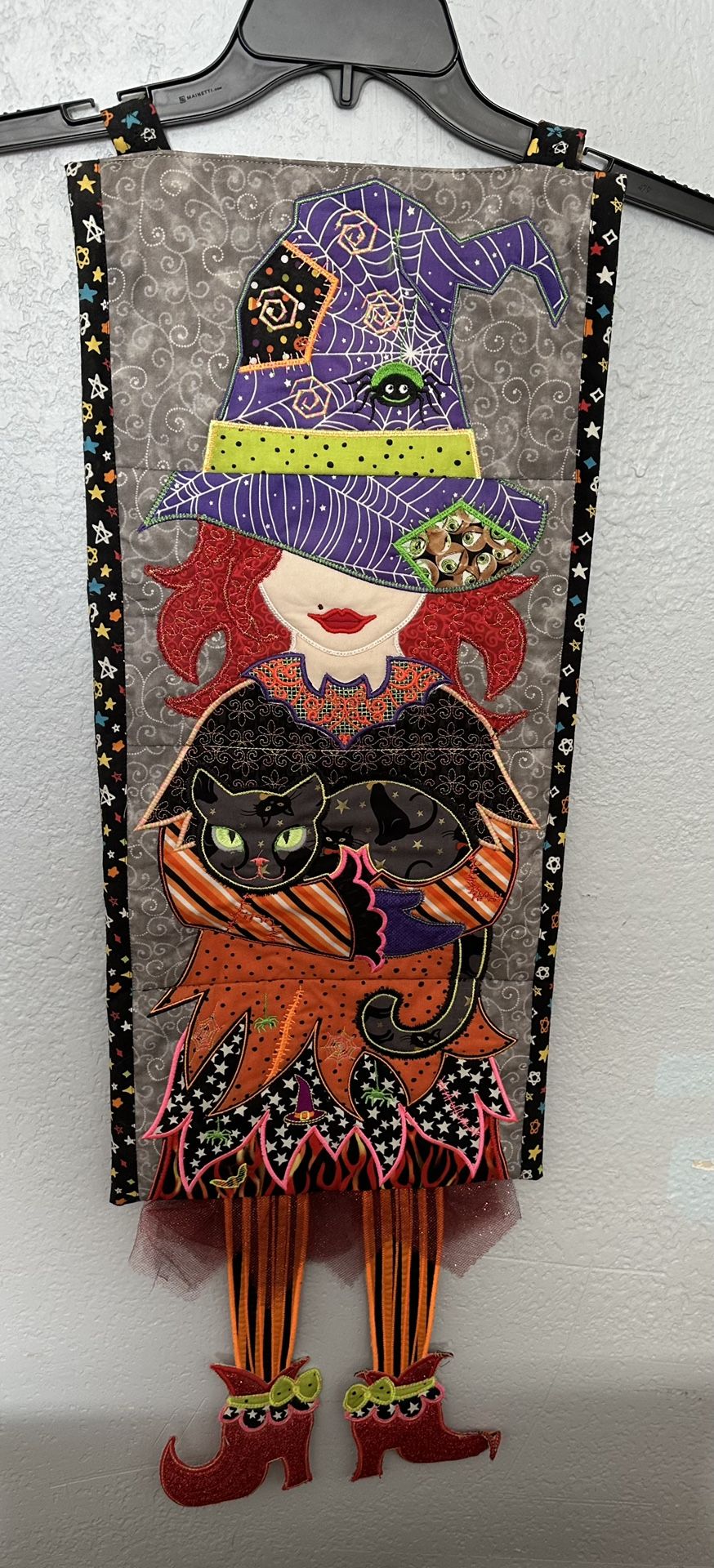 Cute Handmade Witch Wall Hanging Embroidered 35”x11.5”