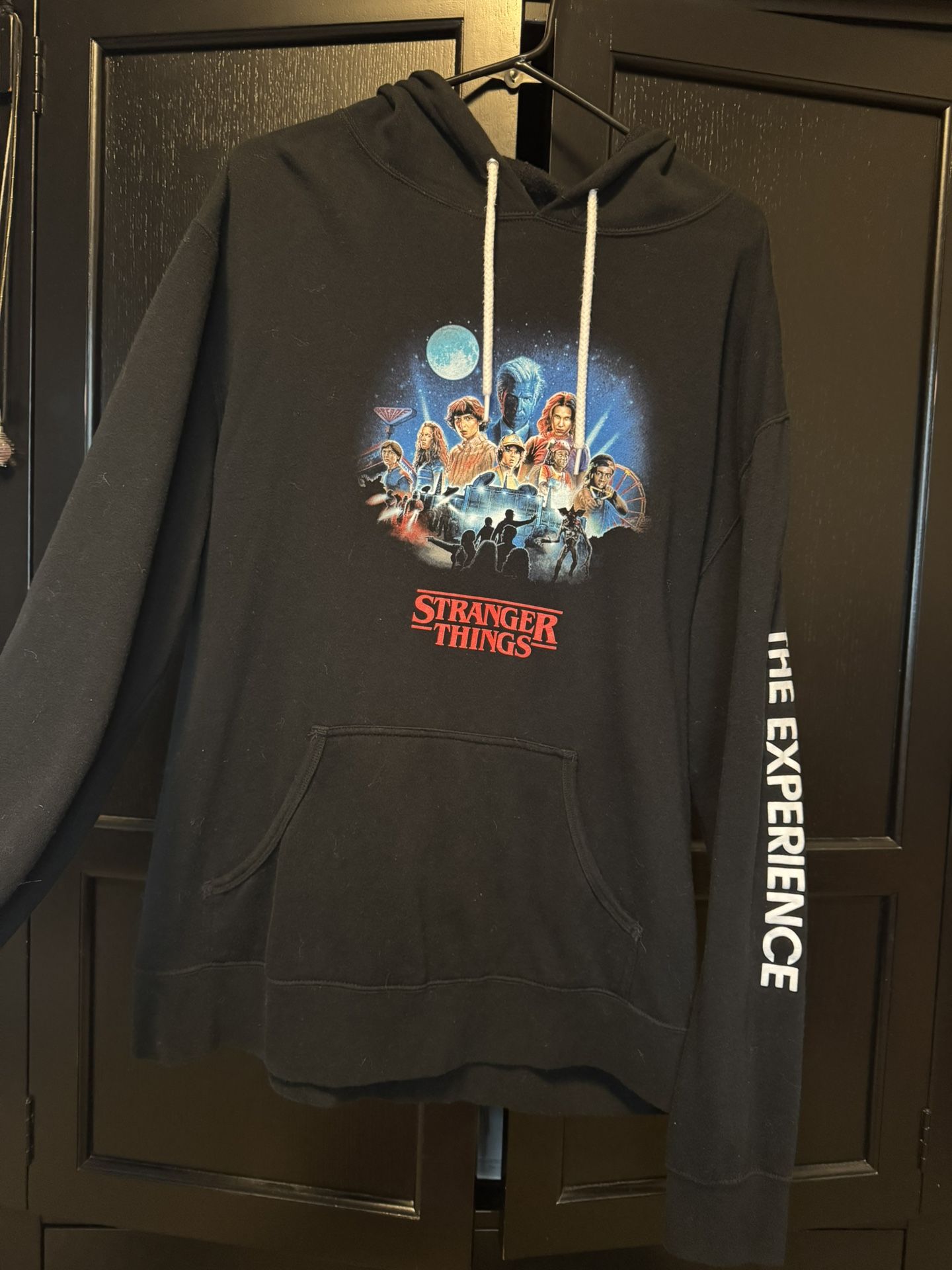I bought this hoodie at the Stranger Things experience in Seattle a couple years ago. In great condition, it’s been worn twice and washed once. Size XXL, but seems to fit slightly on the smaller side. All black other than detailing.