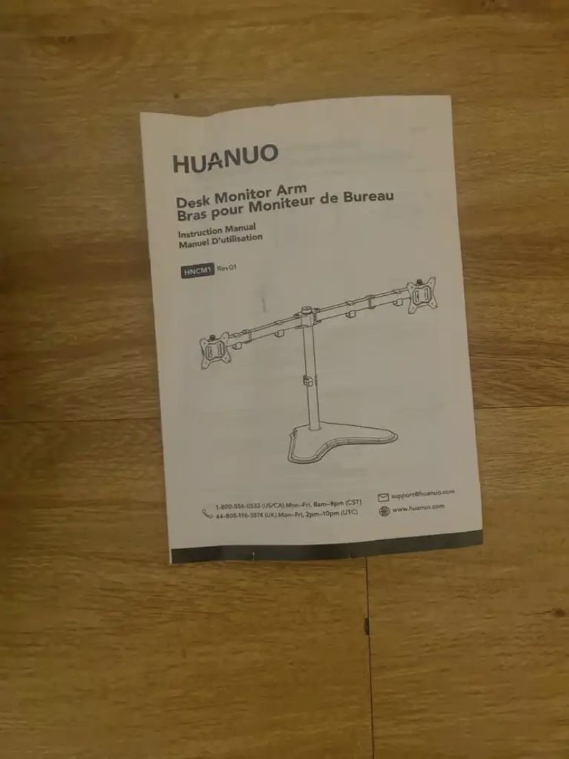 HUANUO dual monitor stand (HNCM1/CM1) with heavy-duty free-standing base. Supports two monitors 13”–32”, VESA 75x75 / 100x100, up to 17.6 lbs per arm. Condition: Open box — opened only to verify contents. Parts are still bagged/packaged as shown. Includes: stand components + hardware/bolts (see photos) + instruction manual. Great for freeing desk space and positioning monitors with tilt/swivel/rotation adjustments. Local pickup or shipping depending on platform.