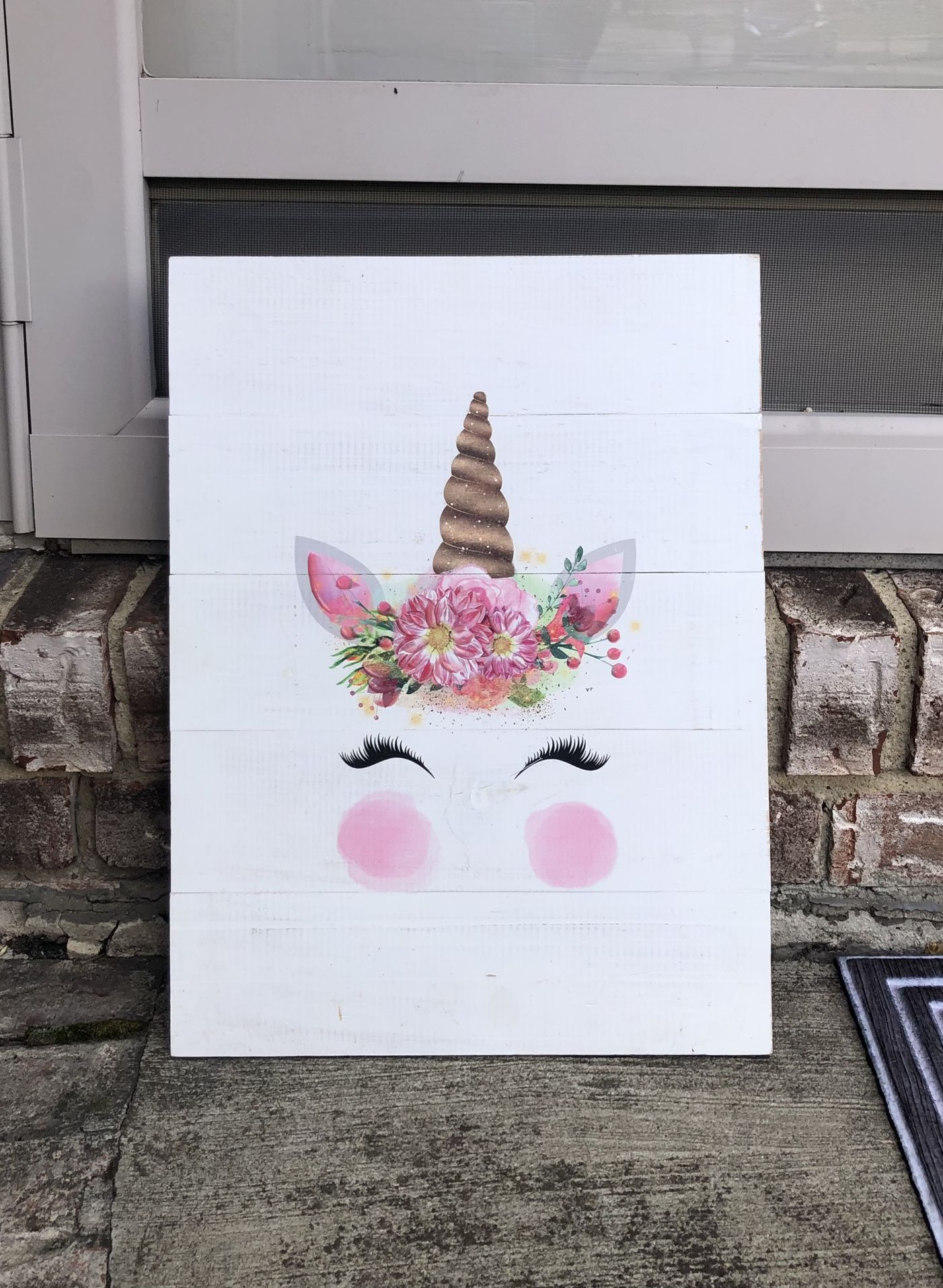 White-and-pink unicorn head painted on a distressed, painted wood-slat board. Embellished with thick paint droplets (to resemble flowers) and glitter on the horn. 2 secure metal hooks mounted on back for hanging. Or picture could be leaned against a wall instead of hanging for a more rustic look. Would make a super-cute addition to a fantasy-themed little girl’s room or kids’ play room! A super deal! Originally purchased at Hobby Lobby for $21.99 (see last photo). 🦄 THANK YOU for your interest in my item and for placing trust in me. I hope we can help each other! :)