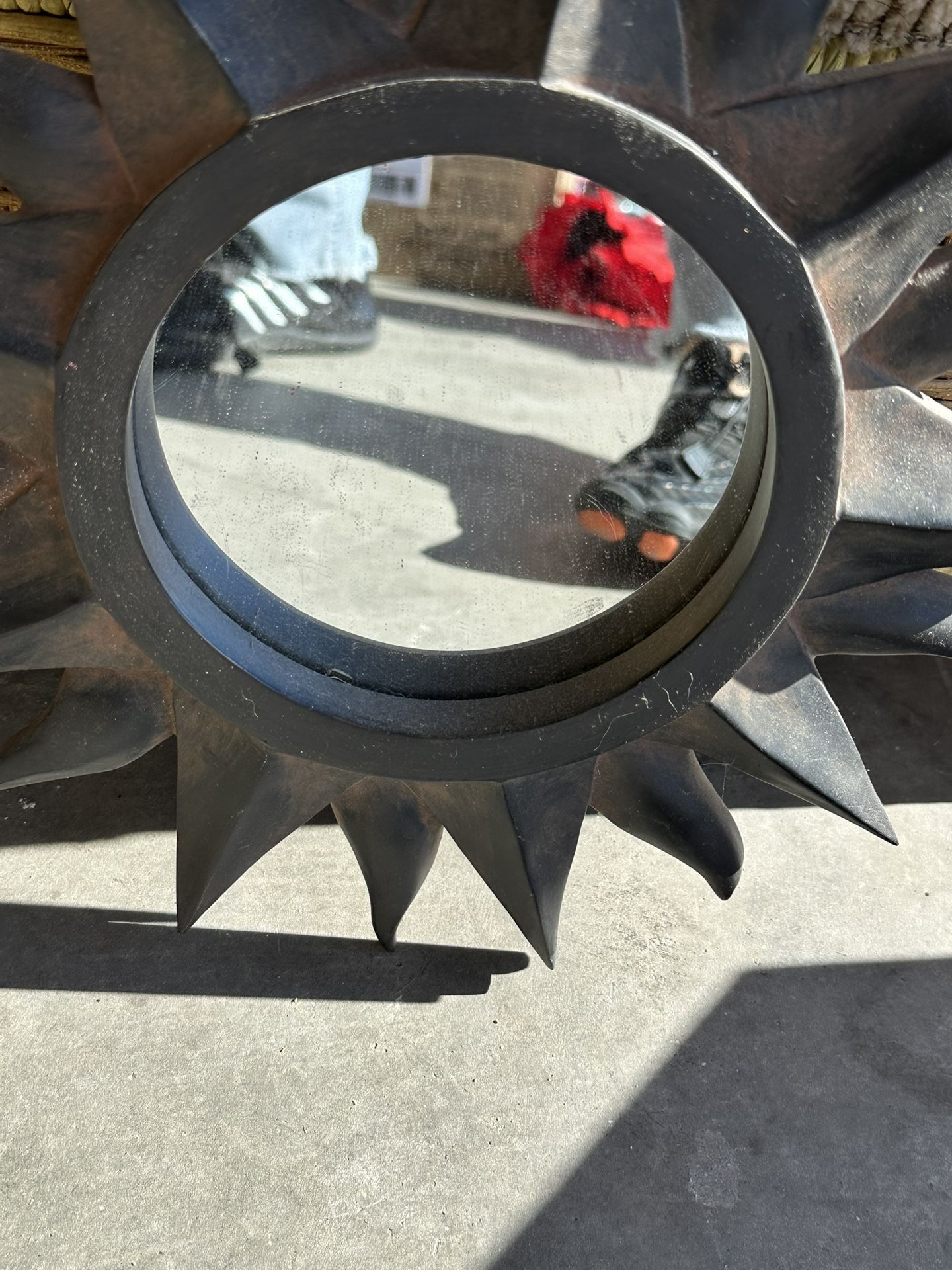 This is a sunburst wall mirror with a dark-toned, possibly bronze or black metal frame